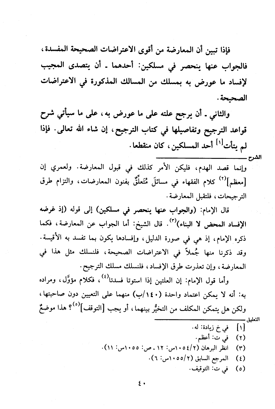 قال الإمام: (والجواب عنها ينحصر في مسلكين) إلى قوله (إذ غرضه الإفساد المحض لا البناء). قال الشيخ: أما الجواب عن المعارضة، فكما ذكره الإمام، إذ هي في صورة الدليل، وإفسادها يكون بما تفسد به الأقيسة. وقد ذكرنا منها جملًا في الاعتراضات الصحيحة، فلنسلك مثل هذا في المعارضة، وإن تعذرت طرق الإفساد، فلنسلك مسلك الترجيح.