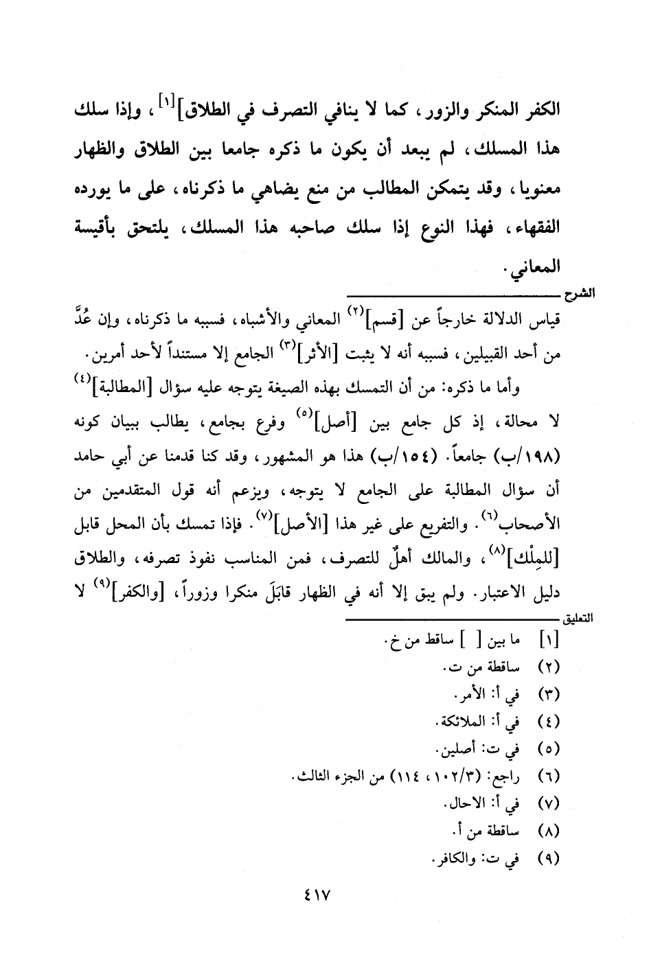 وأما ما ذكره: من أن التمسك بهذه الصيغة يتوجه عليه سؤال [المطالبة] لا محالة، إذ كل جامع بين [أصل] وفرع بجامع، يطالب ببيان كونه (١٩٨/ ب) جامعًا. (١٥٤/ ب) هذا هو المشهور، وقد كنا قدمنا عن أبي حامد أن سؤال المطالبة على الجامع لا يتوجه، ويزعم أنه قول المتقدمين من الأصحاب. والتفريع على غير هذا [الأصل]. فإذا تمسك بأن المحل قابل [للملك]، والمالك أهل للتصرف، فمن المناسب نفوذ تصرفه، والطلاق دليل الاعتبار. ولم يبق إلا أنه في الظهار قابل منكرًا وزورًا، [والكفر] لا