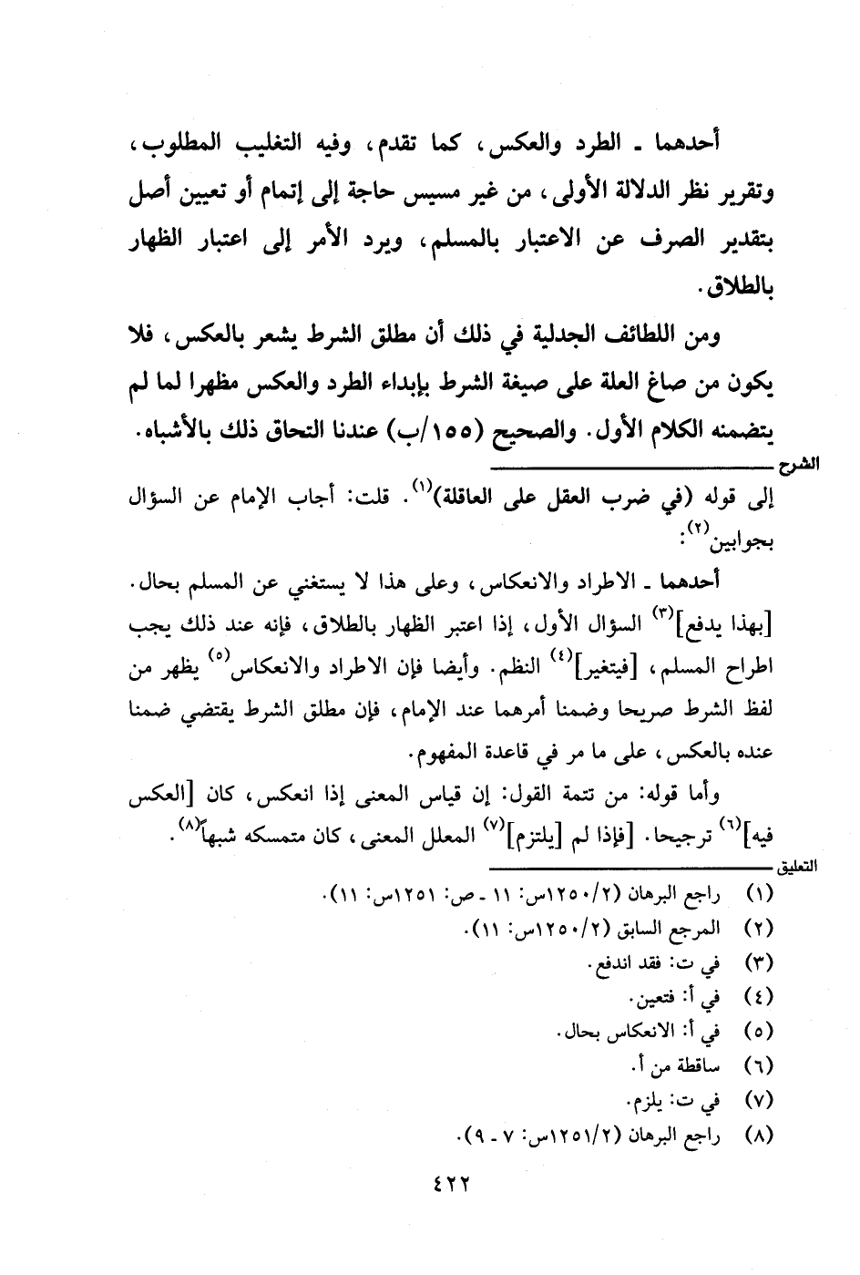 أحدهما- الاطراد والانعكاس، وعلى هذا لا يستغني عن المسلم بحال. [بهذا يدفع] السؤال الأول، إذا اعتبر الظهار بالطلاق، فإنه عند ذلك يجب اطراح المسلم، [فيتغير] النظم. وأيضًا فإن الاطراد والانعكاس يظهر من لفظ الشرط صريحًا وضمنًا أمرهما عند الإمام، فإن مطلق الشرط يقتضي ضمنًا عنده بالعكس، على ما مر في قاعدة المفهوم.
