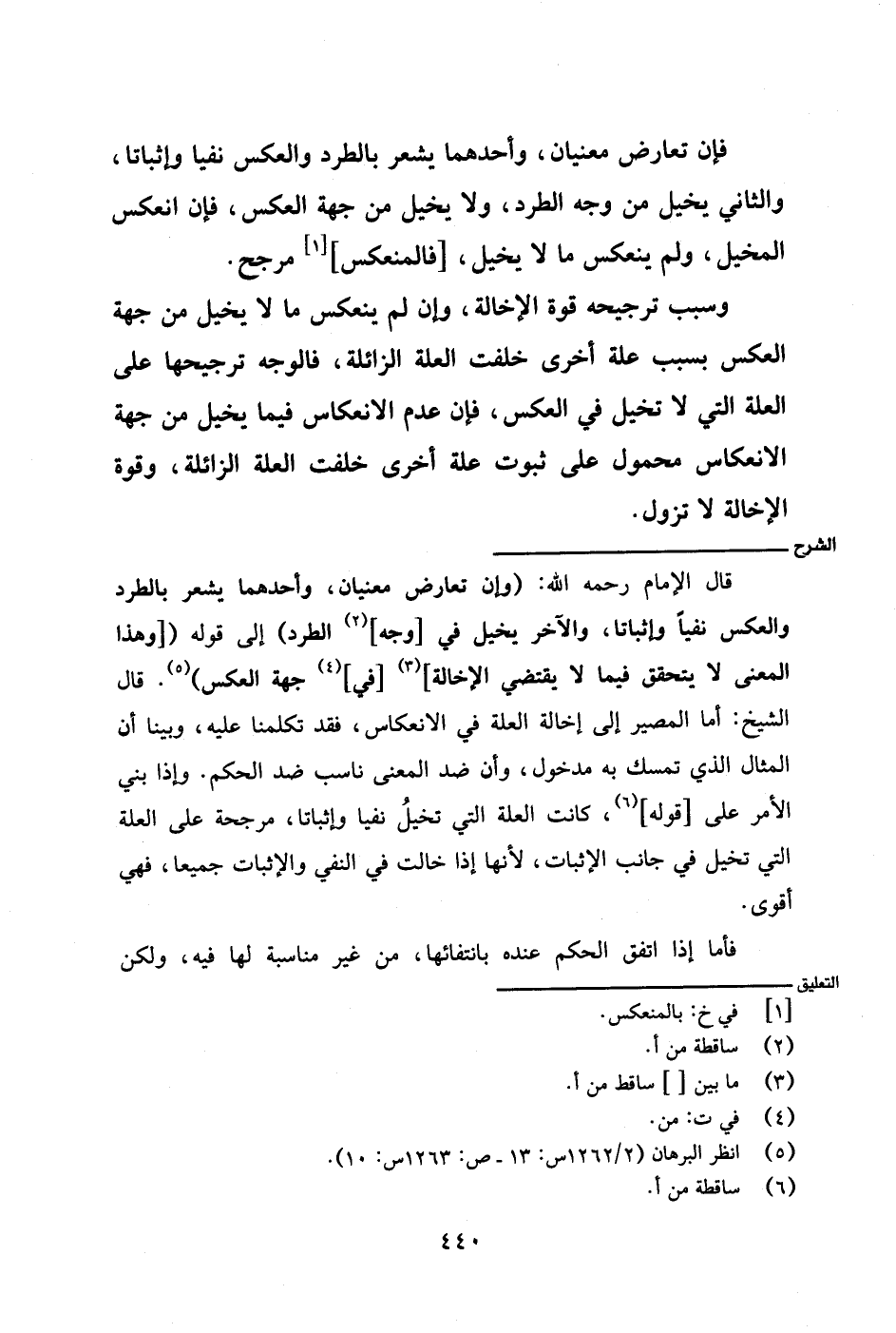 قال الإمام رحمه الله: (وإن تعارض معنيان، وأحدهما يشعر بالطرد والعكس نفيًا وإثباتًا، والآخر يخيل في [وجه] الطرد) إلى قوله ([وهذا المعنى لا يتحقق فيما لا يقتضي الإخالة] [في] جهة العكس). قال الشيخ: أما المصير إلى إخالة العلة في الانعكاس، فقد تكلمنا عليه، وبينا أن المثال الذي تمسك به مدخول، وأن ضد المعنى ناسب ضد الحكم. وإذا بني الأمر على [قوله]، كانت العلة التي تخيل نفيًا وإثباتًا، مرجحة على العلة التي تخيل في جانب الإثبات، لأنها إذا خالت في النفي والإثبات جميعًا، فهي أقوى.