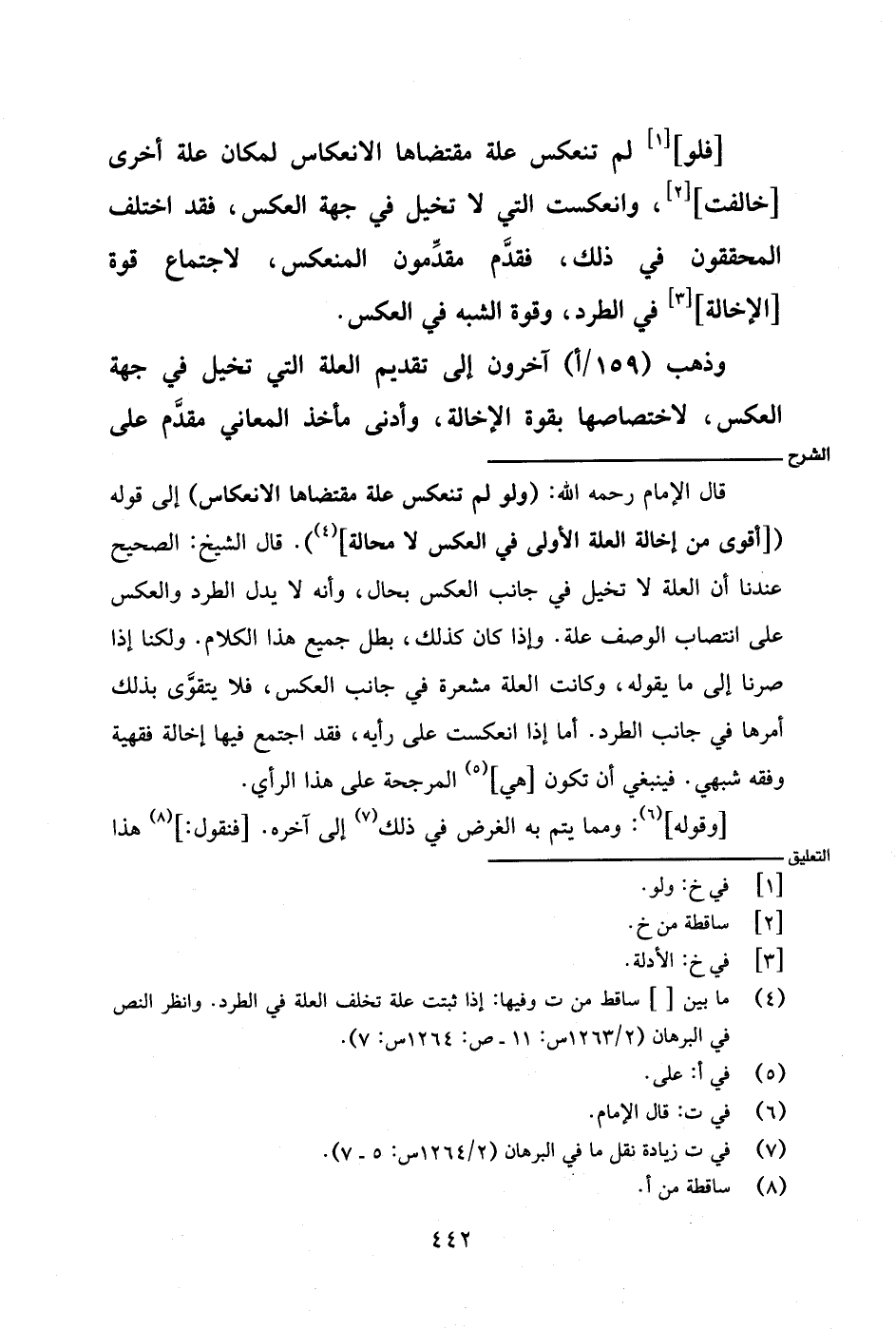 قال الإمام رحمه الله: (ولو لم تنعكس علة مقتضاها الانعكاس) إلى قوله ([أقوى من إخالة العلة الأولى في العكس لا محالة]). قال الشيخ: الصحيح عندنا أن العلة لا تخيل في جانب العكس بحال، وأنه لا يدل الطرد والعكس على انتصاب الوصف علة. وإذا كان كذلك، بطل جميع هذا الكلام. ولكنا إذا صرنا إلى ما يقوله، وكانت العلة مشعرة في جانب العكس، فلا يتقوى بذلك أمرها في جانب الطرد. أما إذا انعكست على رأيه، فقد اجتمع فيها إخالة فقهية وفقه شبهي. فينبغي أن تكون [هي] المرجحة على هذا الرأي.