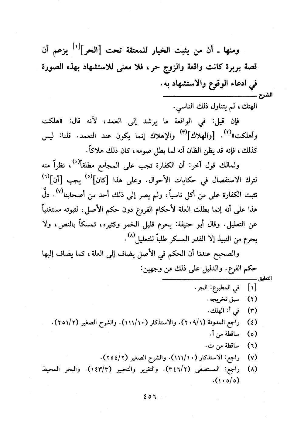 ولمالك قول آخر: أن الكفارة تجب على المجامع مطلقًا، نظرًا منه لترك الاستفصال في حكايات الأحوال. وعلى هذا [كان] يجب [أن] تثبت الكفارة على من أكل ناسيًا، ولم يصر إلى ذلك أحد من أصحابنا. دل هذا على أنه إنما بطلت العلة لأحكام الفروع دون حكم الأصل، لثبوته مستغنيًا عن التعليل. وقال أبو حنيفة: يحرم قليل الخمر وكثيره، تمسكًا بالنص، ولا يحرم من النبيذ إلا القدر المسكر طلبًا للتعليل.