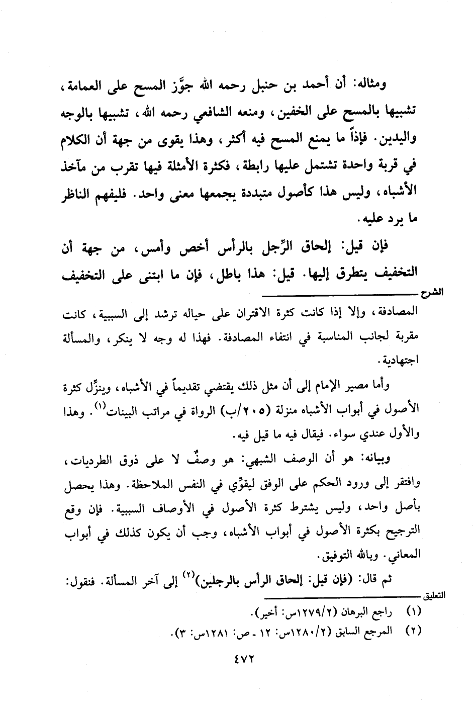وأما مصير الإمام إلى أن مثل ذلك يقتضي تقديمًا في الأشباه، وينزِّل كثرة الأصول في أبواب الأشباه منزلة (٢٠٥/ ب) الرواة في مراتب البينات. وهذا والأول عندي سواء. فيقال فيه ما قيل فيه.
