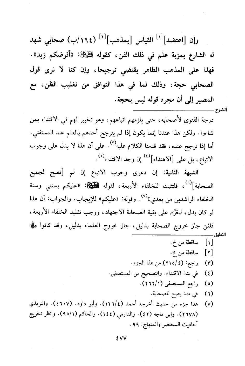الشبهة الثانية: إن دعوى وجوب الاتباع إن لم [تصح لجميع الصحابة]، فلتثبت للخلفاء الأربعة، لقوله - عليه السلام -: «عليكم بسنتي وسنة الخلفاء الراشدين من بعدي». وقوله: «عليكم» للإيجاب. والجواب: أن هذا لو كان يدل، لحَرُم على بقية الصحابة الاجتهاد، ووجب تقليد الخلفاء الأربعة، فلئن جاز خروج الصحابة بدليل، جاز خروج العلماء بدليل، وقد كانوا - رضي الله عنهم -