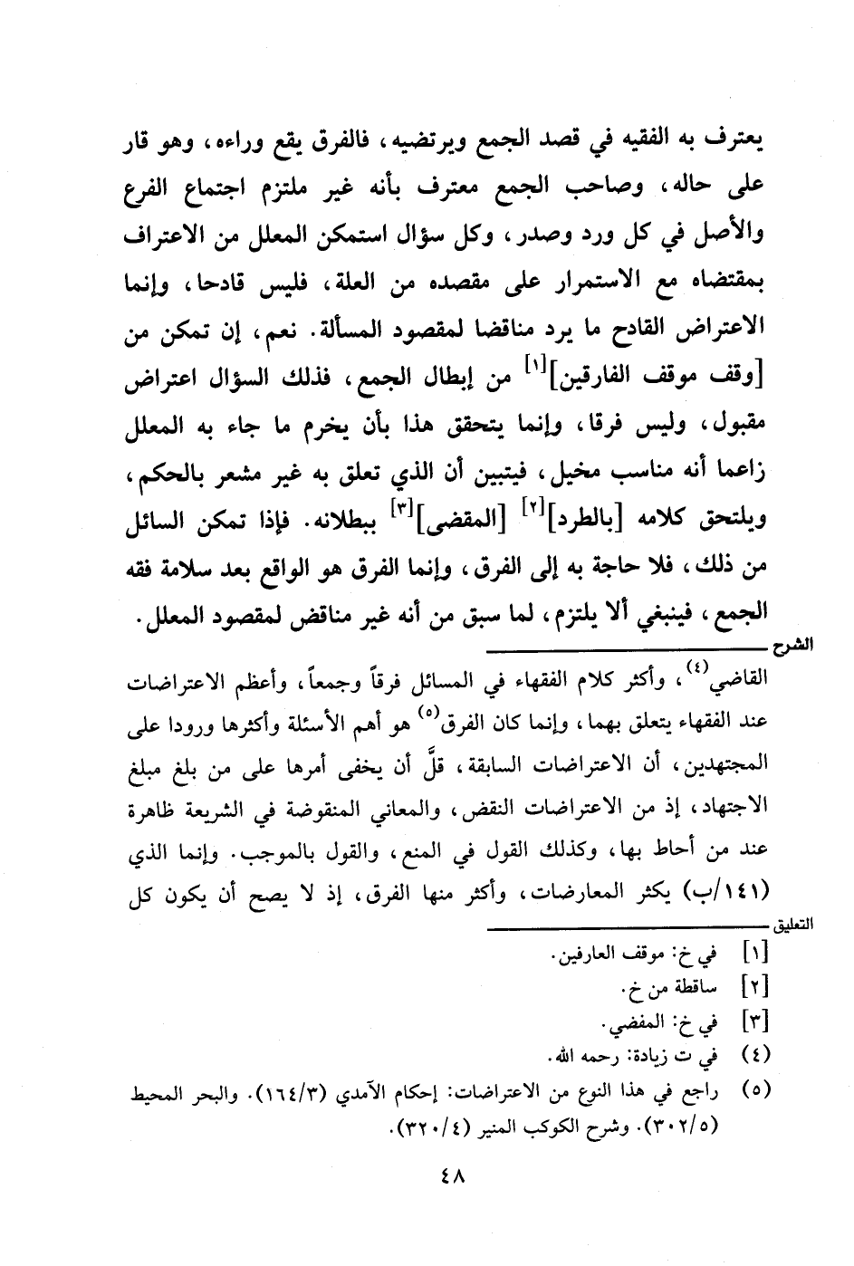 القاضي، وأكثر كلام الفقهاء في المسائل فرقًا وجمعًا، وأعظم الاعتراضات عند الفقهاء يتعلق بهما، وإنما كان الفرق هو أهم الأسئلة وأكثرها ورودًا على المجتهدين، أن الاعتراضات السابقة، قل أن يخفى أمرها على من بلغ مبلغ الاجتهاد، إذ من الاعتراضات النقض، والمعاني المنقوضة في الشريعة ظاهرة عند من أحاط بها، وكذلك القول في المنع، والقول بالموجب. وإنما الذي (١٤١/ ب) يكثر المعارضات، وأكثر منها الفرق، إذ لا يصح أن يكون كل