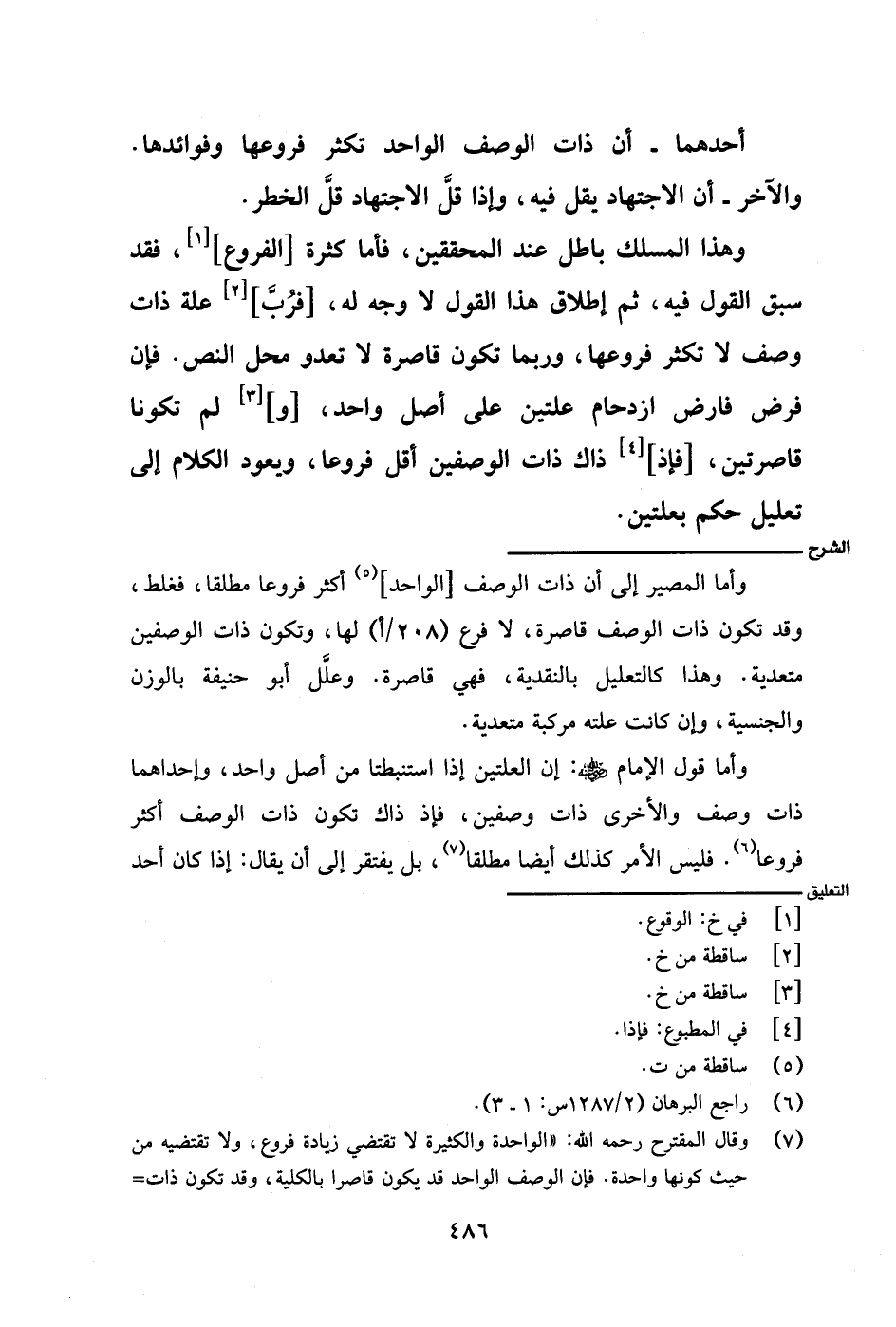 وأما قول الإمام - رضي الله عنه -: إن العلتين إذا استنبطتا من أصل واحد، وإحداهما ذات وصف والأخرى ذات وصفين، فإذ ذاك تكون ذات الوصف أكثر فروعًا. فليس الأمر كذلك أيضًا مطلقًا، بل يفتقر إلى أن يقال: إذا كان أحد