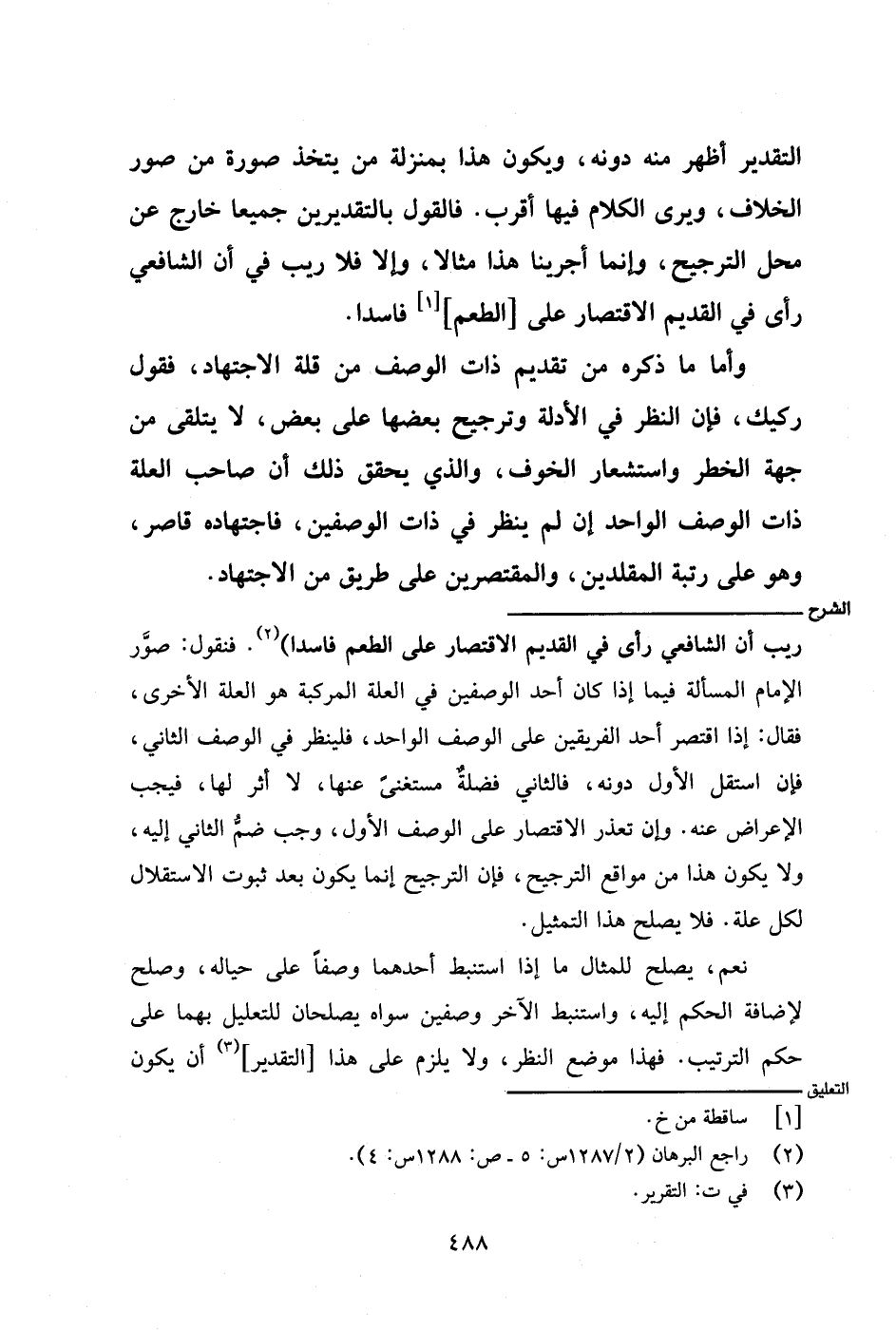 ريب أن الشافعي رأى في القديم الاقتصار على الطعم فاسدًا). فنقول: صوَّر الإمام المسألة فيما إذا كان أحد الوصفين في العلة المركبة هو العلة الأخرى، فقال: إذا اقتصر أحد الفريقين على الوصف الواحد، فلينظر إلى الوصف الثاني، فإن استقل الأول دونه، فالثاني فضلةٌ مستغنىً عنها، لا أثر لها، فيجب الإعراض عنه. وإن تعذر الاقتصار على الوصف الأول، وجب ضمُّ الثاني إليه، ولا يكون هذا من مواقع الترجيح، فإن الترجيح إنما يكون بعد ثبوت الاستقلال لكل علة. فلا يصلح هذا التمثيل.