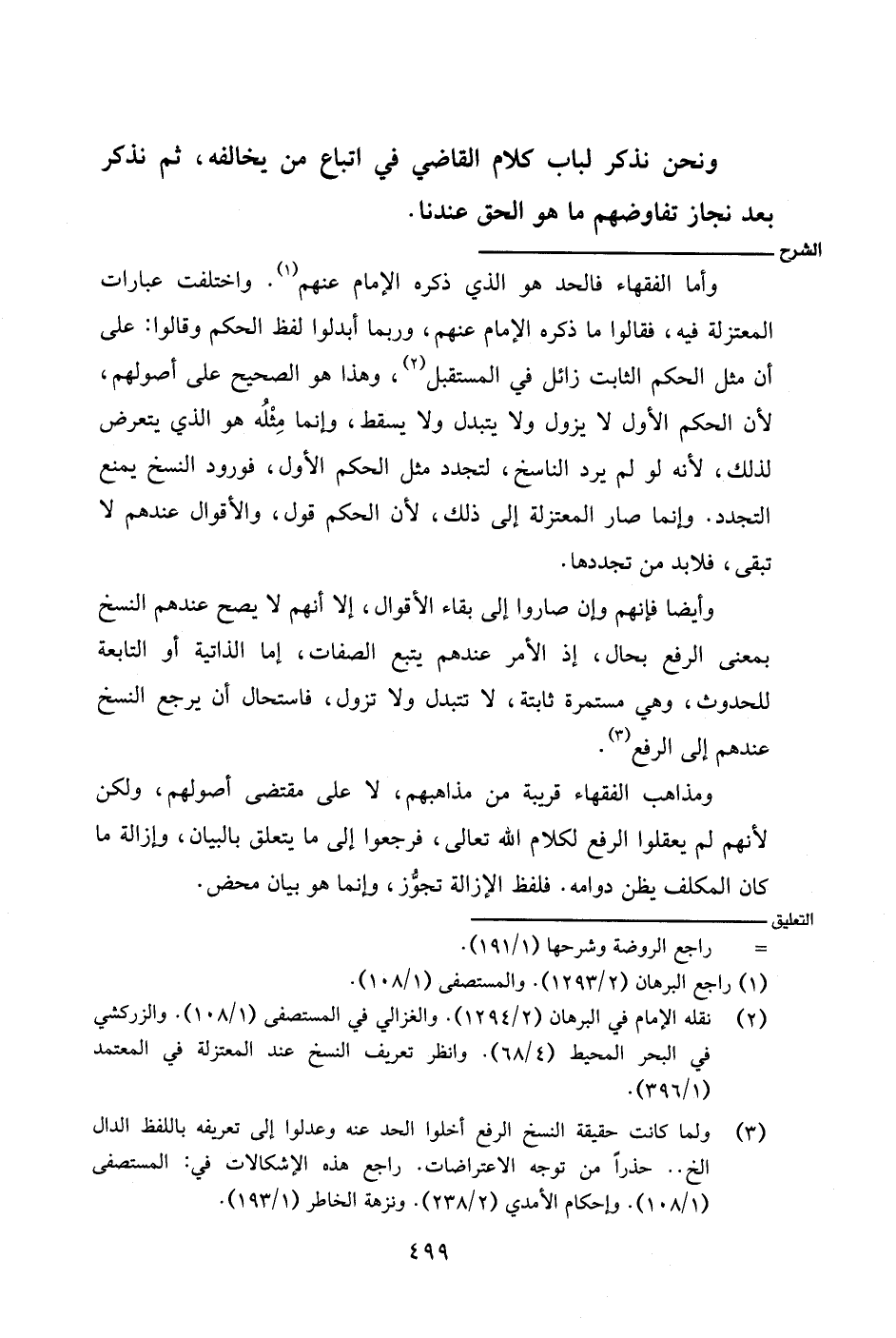وأما الفقهاء فالحد هو الذي ذكره الإمام عنهم. واختلفت عبارات المعتزلة فيه، فقالوا ما ذكره الإمام عنهم، وربما أبدلوا لفظ الحكم وقالوا: على أن مثل الحكم الثابت زائل في المستقبل، وهذا هو الصحيح على أصولهم، لأن الحكم الأول لا يزول ولا يتبدل ولا يسقط، وإنما مِثْله هو الذي يتعرض لذلك، لأنه لو لم يرد الناسخ، لتجدد مثل الحكم الأول، فورود النسخ يمنع التجدد. وإنما صار المعتزلة إلى ذلك، لأن الحكم قول، والأقوال عندهم لا تبقى، فلابد من تجددها.