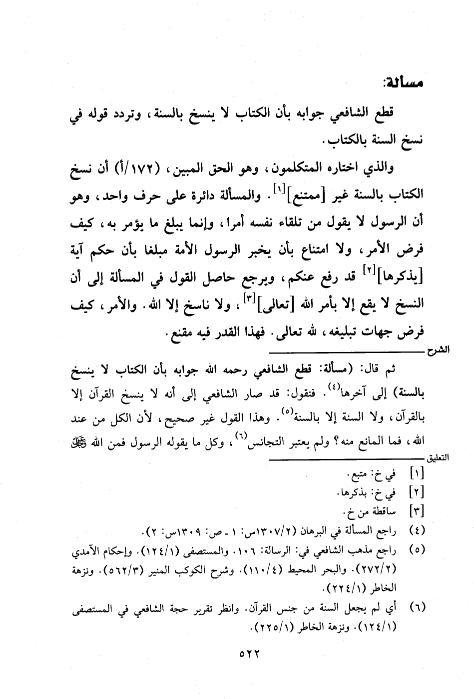 ثم قال: (مسألة: قطع الشافعي رحم الله جوابه لأن الكتاب لا ينسخ بالسنة) إلى آخرها. فنقول: قد صار الشافعي إلى أنه لا ينسخ القرآن إلا بالقرآن، ولا السنة إلا بالسنة. وهذا القول غير صحيح، لأن الكل من عند الله، فما المانع منه؟ ولم يعتبر التجانس، وكل ما يقوله الرسول فمن الله - عز وجل -