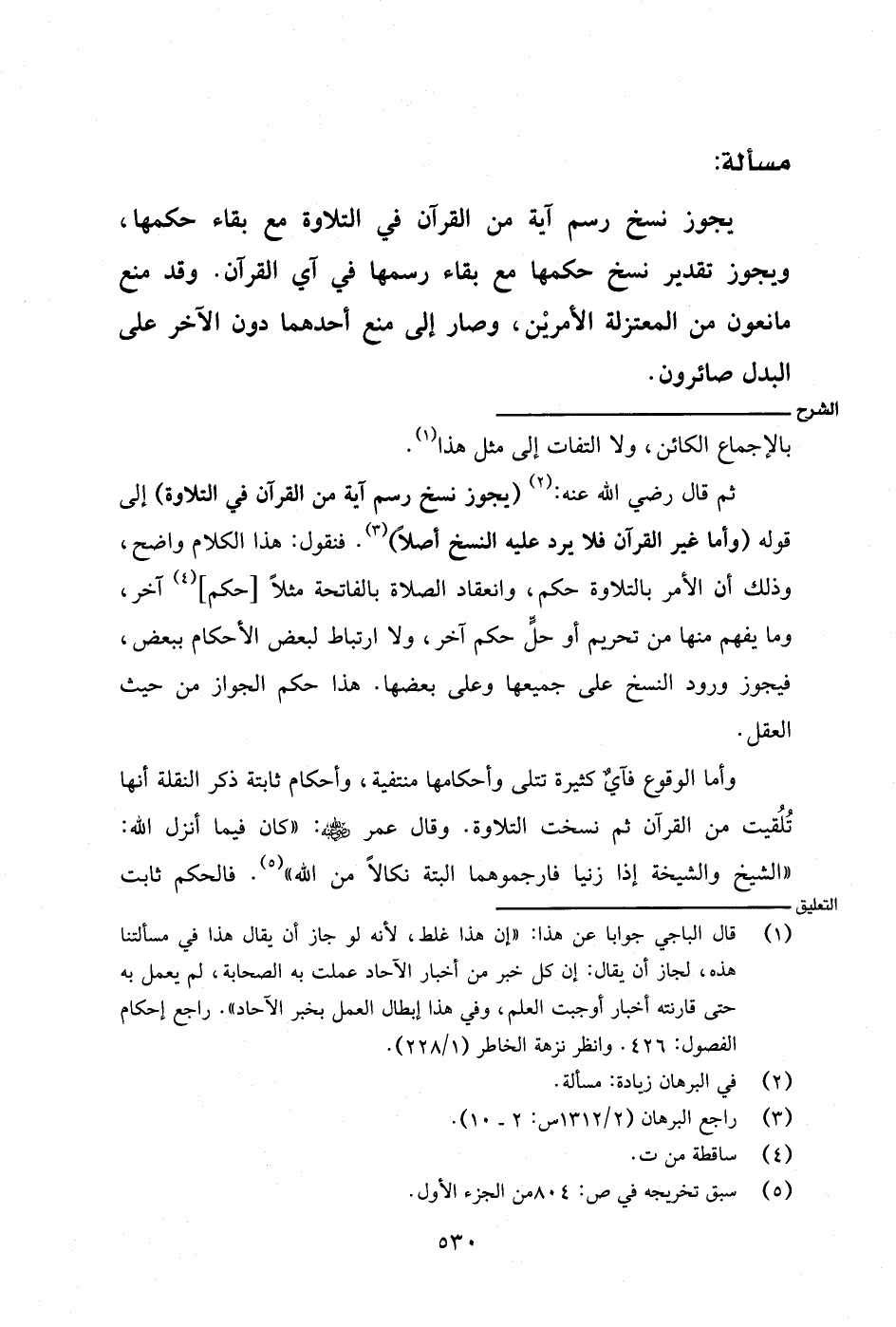 ثم قال - رضي الله عنه -: (يجوز نسخ رسم آية من القرآن في التلاوة) إلى قوله (وأما غير القرآن فلا يرد عليه النسخ أصلًا). فنقول: هذا الكلام واضح، وذلك أن الأمر بالتلاوة حكم، وانعقاد الصلاة بالفاتحة مثلًا [حكم] آخر، وما يفهم منها من تحريم أو حل حكم آخر، ولا ارتباط لبعض الأحكام ببعض، فيجوز ورود النسخ على جميعها وعلى بعضها. هذا حكم الجواز من حيث العقل.