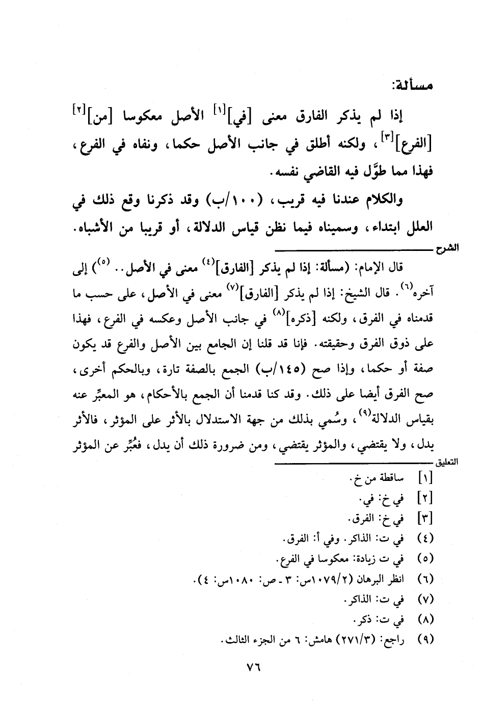 قال الإمام: (مسألة: إذا لم يذكر [الفارق] معنى في الأصل .. ) إلى آخره. قال الشيخ: إذا لم يذكر [الفارق] معنى في الأصل، على حسب ما قدمناه في الفرق، ولكنه [ذكره] في جانب الأصل وعكسه في الفرع، فهذا على ذوق الفرق وحقيقته. فإنا قد قلنا إن الجامع بين الأصل والفرع قد يكون صفة أو حكمًا، وإذا صح (١٤٥/ ب) الجمع بالصفة تارة، وبالحكم أخرى، صح الفرق أيضًا على ذلك. وقد كنا قدمنا أن الجمع بالأحكام، هو المعبر عنه بقياس الدلالة، وسمي بذلك من جهة الاستدلال بالأثر على المؤثر، فالأثر يدل، ولا يقتضي، والمؤثر يقتضي، ومن ضرورة ذلك أن يدل، فعُبِّر عن المؤثر