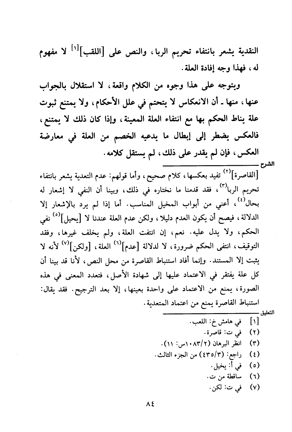 [القاصرة] تفيد بعكسها، كلام صحيح، وأما قولهم: عدم التعدية يشعر بانتفاء تحريم الربا، فقد قدمنا ما نختاره في ذلك، وبينا أن النفي لا إشعار له بحال، أعني من أبواب المخيل المناسب. أما إذا لم يرد بالإشعار إلا الدلالة، فيصح أن يكون العدم دليلًا، ولكن عدم العلة عندنا لا [يحيل] نفي الحكم، ولا يدل عليه. نعم، إن انتفت العلة، ولم يخلف غيرها، وفقد التوقيف، انتفى الحكم ضرورة، لا لدلالة [عدم] العلة، [ولكن] لأنه لا يثبت إلا المستند. وإنما أفاد استنباط القاصرة من محل النص، لأنا قد بينا أن كل علة يفتقر في الاعتماد عليها إلى شهادة الأصل، فتعدد المعنى في هذه الصورة، يمنع من الاعتماد على واحدة بعينها، إلا بعد الترجيح. فقد يقال: