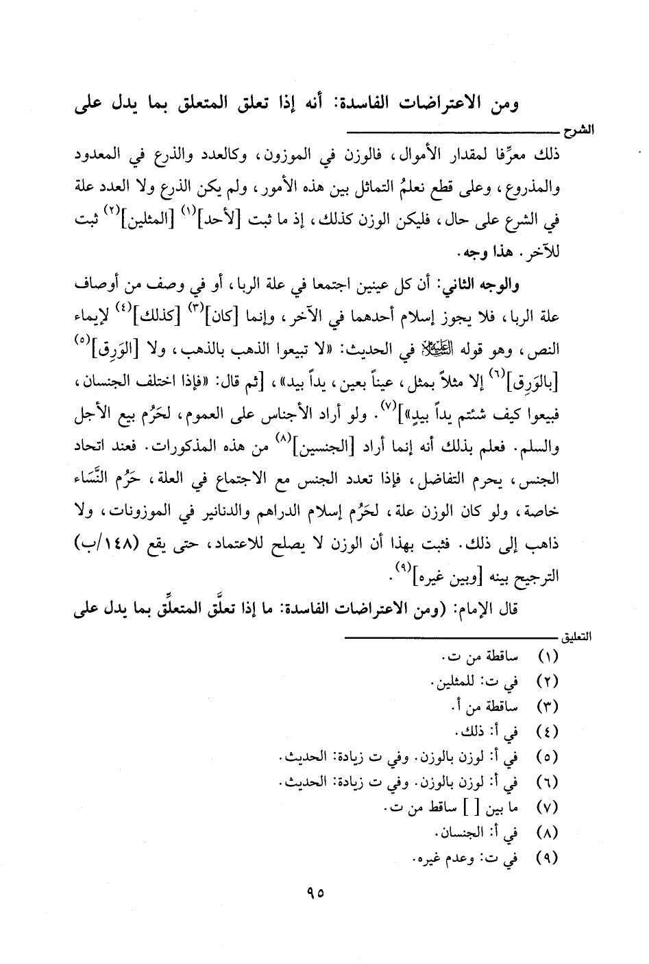 والوجه الثاني: أن كل عينين اجتمعا في علة الربا، أو في وصف من أوصاف علة الربا، فلا يجوز إسلام أحدهما في الآخر، وإنما [كان] [كذلك] لإيماء النص، وهو قوله - عليه السلام - في الحديث: "لا تبيعوا الذهب بالذهب، ولا [الورق] [بالورق] إلا مثلًا بمثل، عينًا بعين، يدًا بيد". [ثم قال: "فإذا اختلف الجنسان، فبيعوا كيف شئتم يدًا بيد]. ولو أراد الأجناس على العموم، لحُرم بيع الأجل والسلم. فعلم بذلك أنه إنما أراد [الجنسين] من هذه المذكورات. فعند اتحاد الجنس، يحرم التفاضل، فإذا تعدد الجنس مع الاجتماع في العلة، حرُم النَّساء خاصة، ولو كان الوزن علة، لحَرُم إسلام الدراهم والدنانير في الموزونات، ولا ذاهب إلى ذلك. فثبت بهذا أن الوزن لا يصلح للاعتماد، حتى يقع (١٤٨/ ب) الترجيح بينه [وبين غيره].