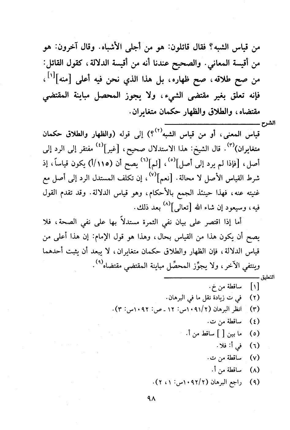 قياس المعنى، أو من قياس الشبه؟ ) إلى قوله (والظهار والطلاق حكمان متغايران). قال الشيخ: هذا الاستدلال صحيح، [غير] مفتقر إلى الرد إلى أصل، [فإذا لم يرد إلى أصل]، [لم] يصح أن (١١٥/ أ) يكون قياسًا، إذ شرط القياس الأصل لا محالة. [نعم]، إن تكلف المستدل الرد إلى أصل مع غنيته عنه، فهذا حينئذ الجمع بالأحكام، وهو قياس الدلالة. وقد تقدم القول فيه، وسيعود إن شاء الله [تعالى] بعد ذلك.