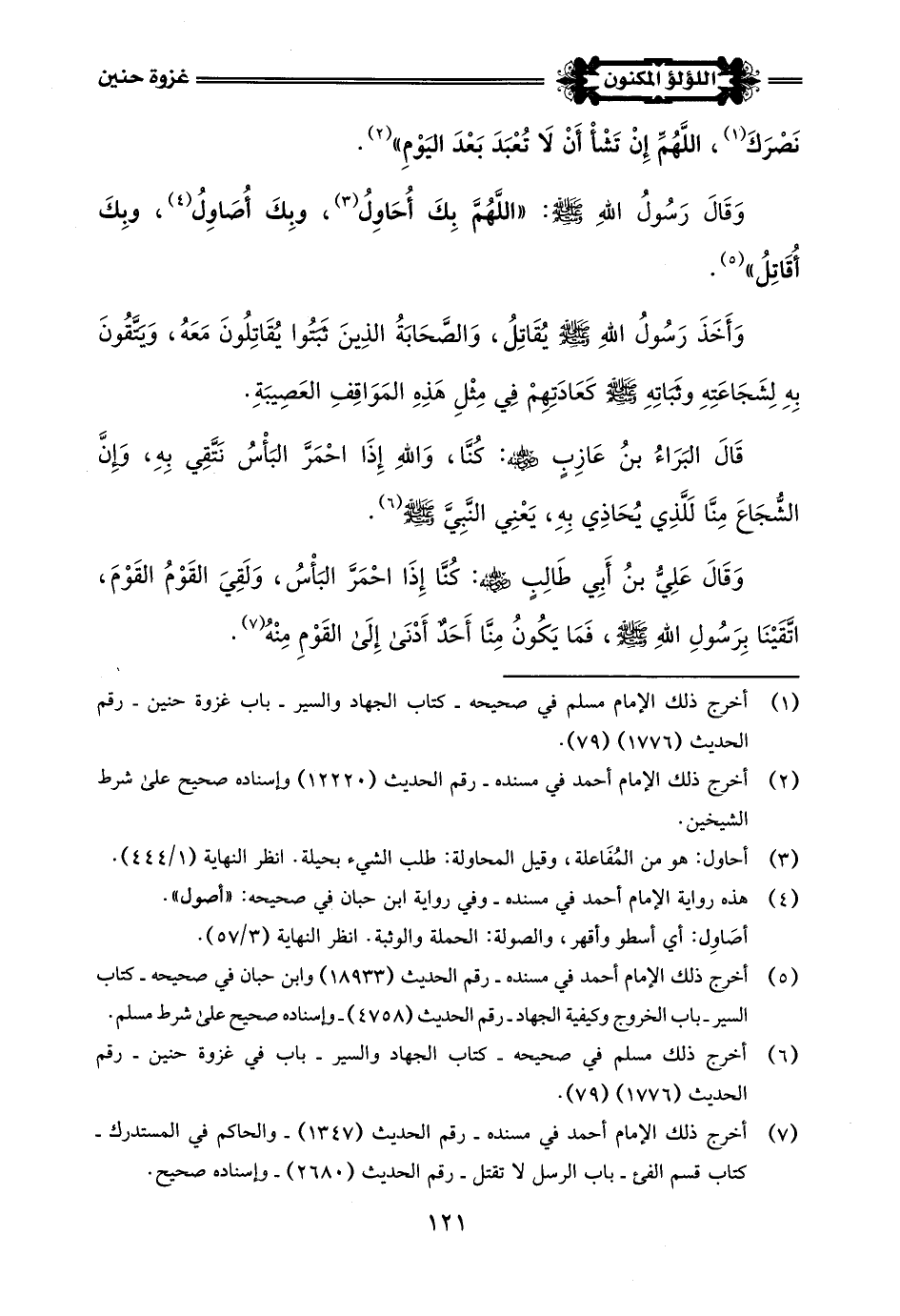 (¬2) قَالَ الحَافِظُ فِي الفَتْحِ (6/ 168): ومما يُنبَه عليه هنا أن البغلة البيضاء التي كان عليها رَسُول اللَّهِ -صلى اللَّه عليه وسلم- فِي حُنَين غير البغلة البيضاء التي أهداها له ملك أَيْلة؛ لأن ذلك كان فِي تَبُوك، وغزوة حنين كانت قبلها، وقد وقع في صحيح مسلم - رقم الحديث (1775) أن البغلة التي كانت تحته -صلى اللَّه عليه وسلم- فِي حنين أهداها له فروة بن نُفَاثة الجُذامي، وهذا هو الصحيح.