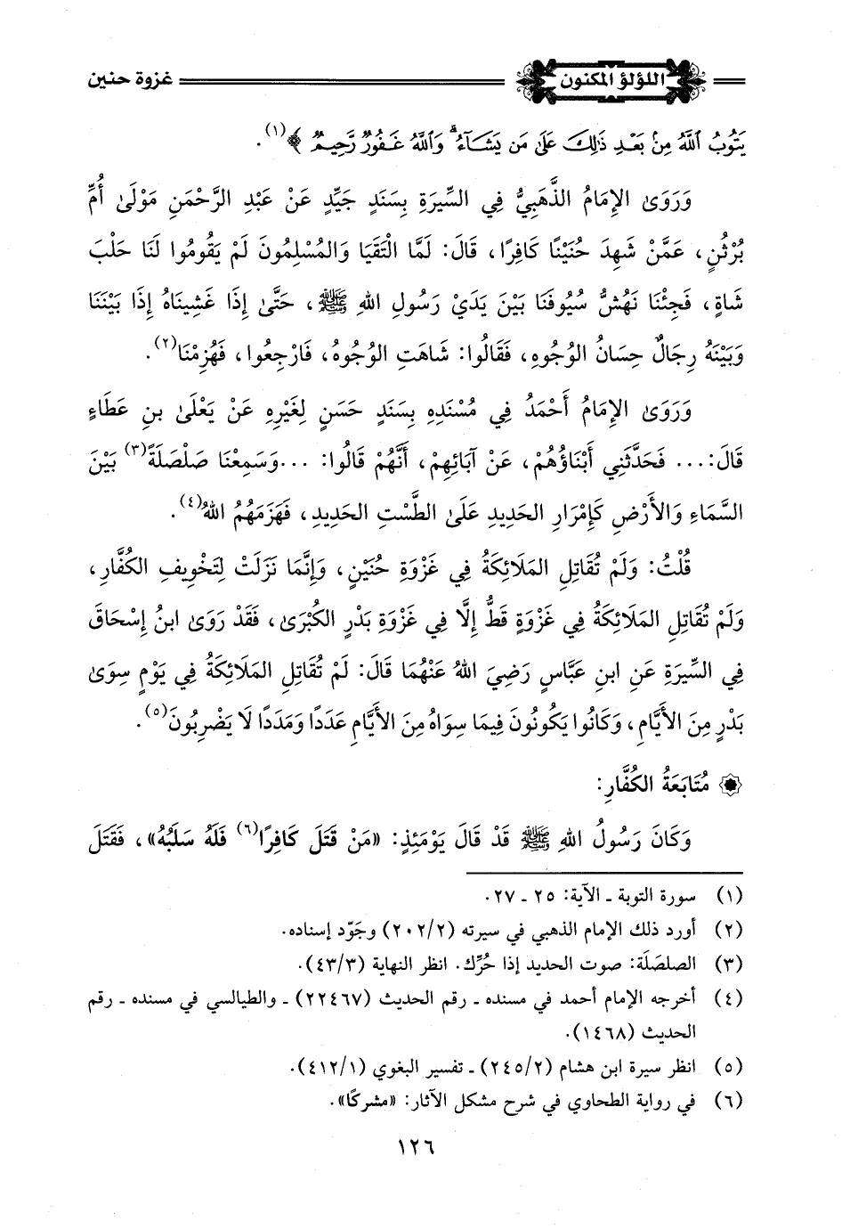 (¬5) أخرج ذلك مسلم في صحيحه - كتاب الجهاد والسير - باب في غزوة حنين - رقم الحديث (1775) - والإمام أحمد في مسنده - رقم الحديث (1775) - وابن حبان في صحيحه - كتاب إخباره -صلى اللَّه عليه وسلم- عن مناقب أصحابه - باب ذكر العباس -رضي اللَّه عنه- رقم الحديث (7049).