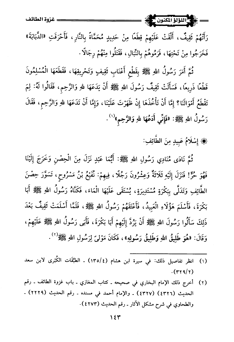 (¬3) أخرج ذلك البخاري في صحيحه - كتاب المغازي - باب غزوة الطائف - رقم الحديث (4324) - وأخرجه في كتاب النكاح - باب ما يُنهى من دخول المتشبهين بالنساء على المرأة - رقم الحديث (5232) - وأخرجه مسلم في صحيحه - كتاب السلام - باب منع المخنث من الدخول على النساء الأجانب - رقم الحديث (2180) - والإمام أحمد في مسنده - رقم الحديث (26490).