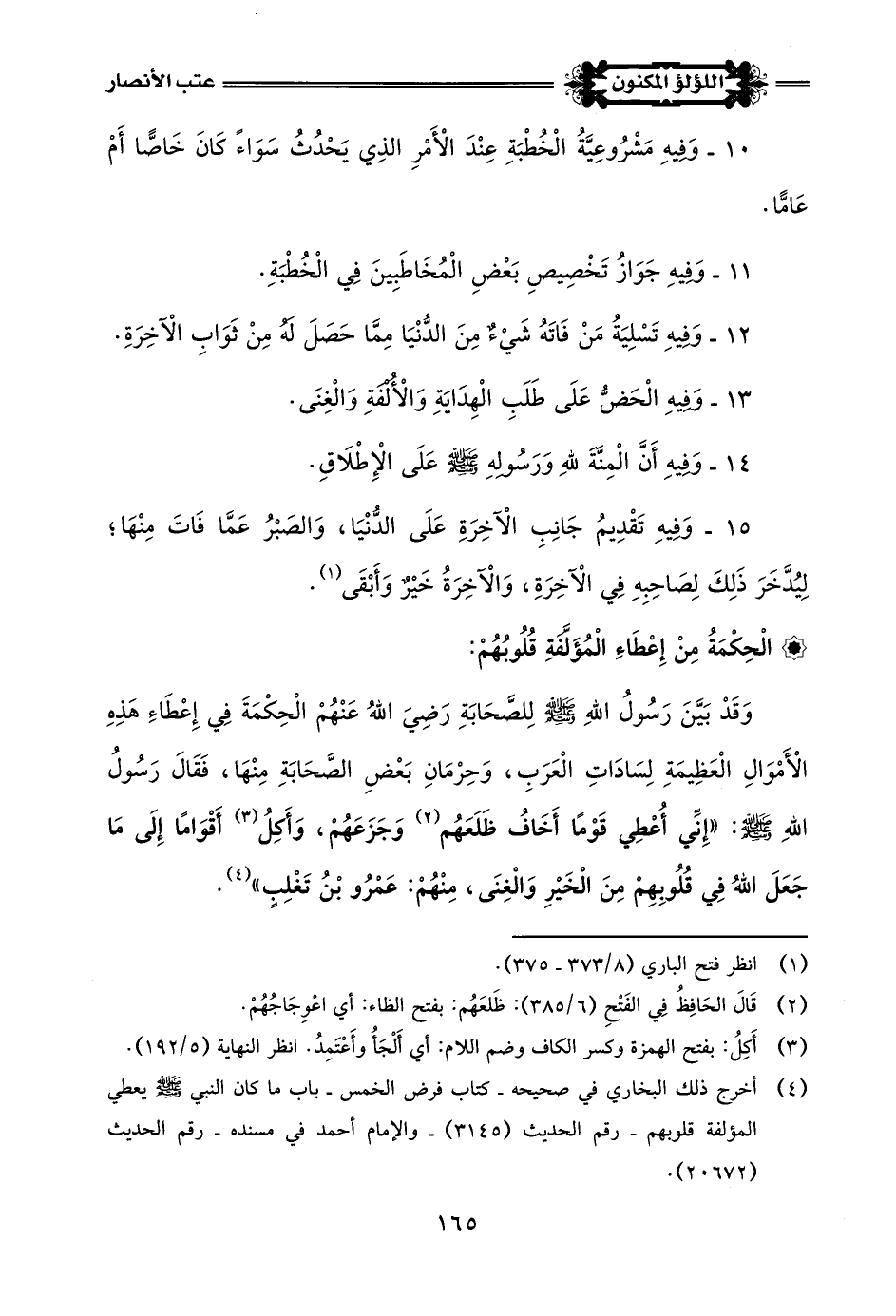 قَالَ الْحَافِظُ فِي الْفَتْحِ: وَقَدْ رَتَّبَ رَسُولُ اللَّهِ -صلى اللَّه عليه وسلم- مَا مَنَّ اللَّهُ عَلَيْهِمْ عَلَى يَدِهِ مِنَ النِّعَمِ تَرْتِيبًا بَالِغًا، فبَدَأَ بِنِعْمَةِ الْإِيمَانِ التِي لَا يُوَازِيها شَيْءٌ مِنْ أَمرِ الدُّنْيَا، وَثَنَّى بِنِعْمَةِ الْأُلفةِ، وَهِيَ أَعْظَمُ مِنْ نِعْمَةِ الْمَالِ؛ لِأَنَّ الْأَموَالَ تُبْذَلُ فِي تَحْصِيلِها، وَقَدْ لَا تُحَصَّلُ، وَقَدْ كَانَتِ الْأَنْصَارُ قَبْلَ الْهِجْرَةِ فِي غَايَةِ التَّنَافُرِ