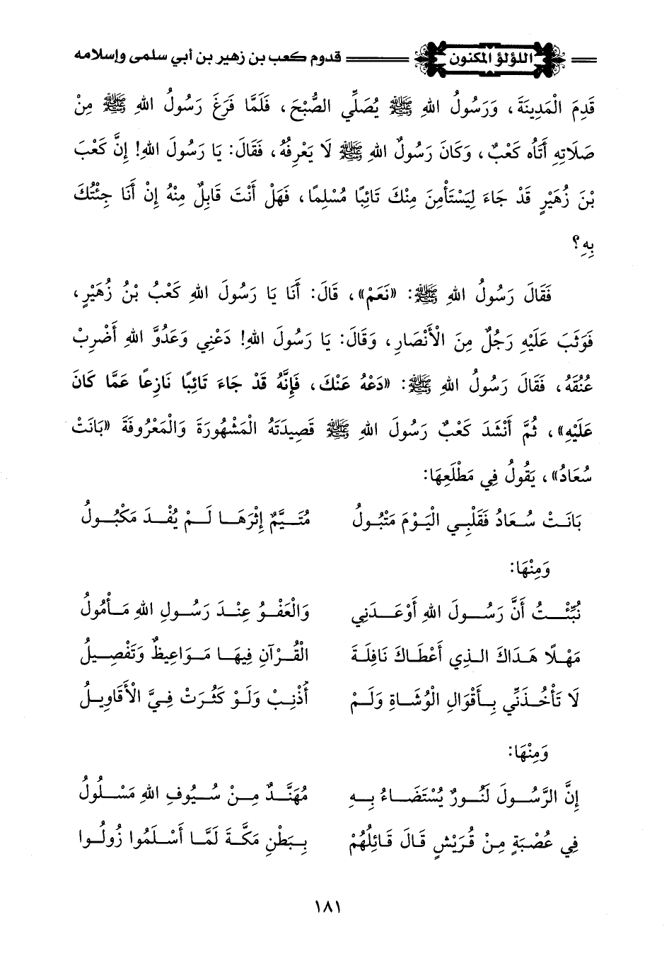 فَلَمَّا بَلَغَ كَعْبًا الْكِتَابُ ضَاقَتْ بِهِ الْأَرْضُ، وَأَشْفَقَ عَلَى نَفْسِهِ، وَأَرْجَفَ (¬1) بِهِ مَنْ كَانَ في حَاضِرِهِ مِنْ عَدُوِّهِ، فَقَالُوا: هُوَ مَقْتُولٌ، فَلَمَّا لَمْ يَجِدْ مِنْ شَيْءٍ بُدًّا أَسْلَمَ، وَقَالَ قَصِيدَتَهُ الرَّائِعَةَ التِي يَمْدَحُ فِيهَا رَسُولَ اللَّهِ -صلى اللَّه عليه وسلم-، وَالْمَعْرُوفَةُ بِاسْمِ "بَانَتْ سُعَادُ"، ذَكَرَ فِيهَا خَوْفَهُ وَإِرْجَافَ الْوُشَاةِ (¬2) بِهِ مِنْ عَدُوِّهِ، ثُمَّ خَرَجَ حَتَّى
