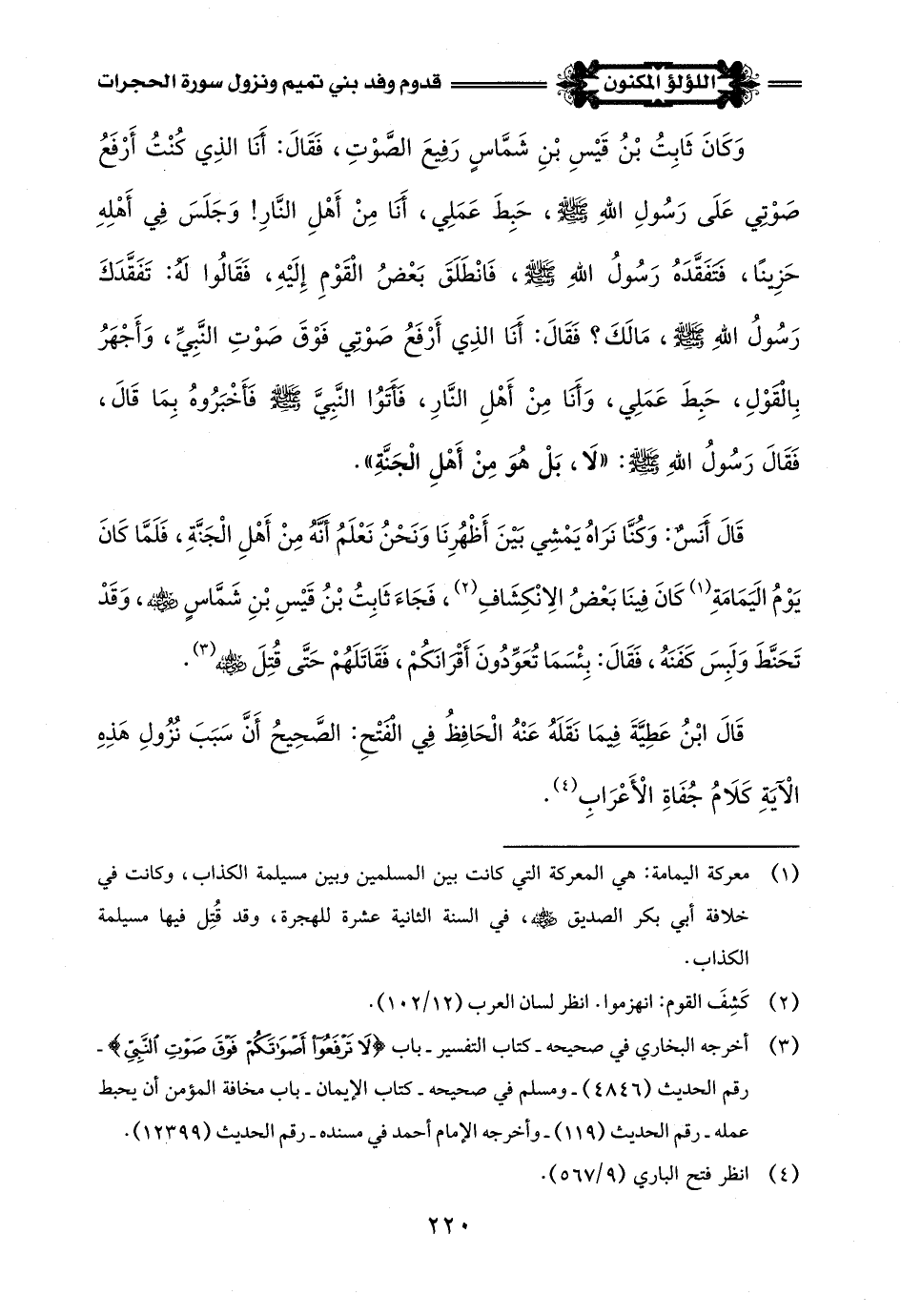 رَوَى الشَّيْخَانِ في صَحِيحَيْهِمَا وَالْإِمَامُ أَحْمَدُ في مُسْنَدِهِ -وَاللَّفْظُ لِأَحْمَدَ- عَنْ أَنَسِ بْنِ مَالِكٍ -رضي اللَّه عنه- قَالَ: لَمَّا نَزَلَتْ هَذِهِ الْآيَةُ: {يَاأَيُّهَا الَّذِينَ آمَنُوا لَا تَرْفَعُوا أَصْوَاتَكُمْ فَوْقَ صَوْتِ النَّبِيِّ وَلَا تَجْهَرُوا لَهُ بِالْقَوْلِ كَجَهْرِ بَعْضِكُمْ لِبَعْضٍ أَنْ تَحْبَطَ أَعْمَالُكُمْ وَأَنْتُمْ لَا تَشْعُرُونَ}.