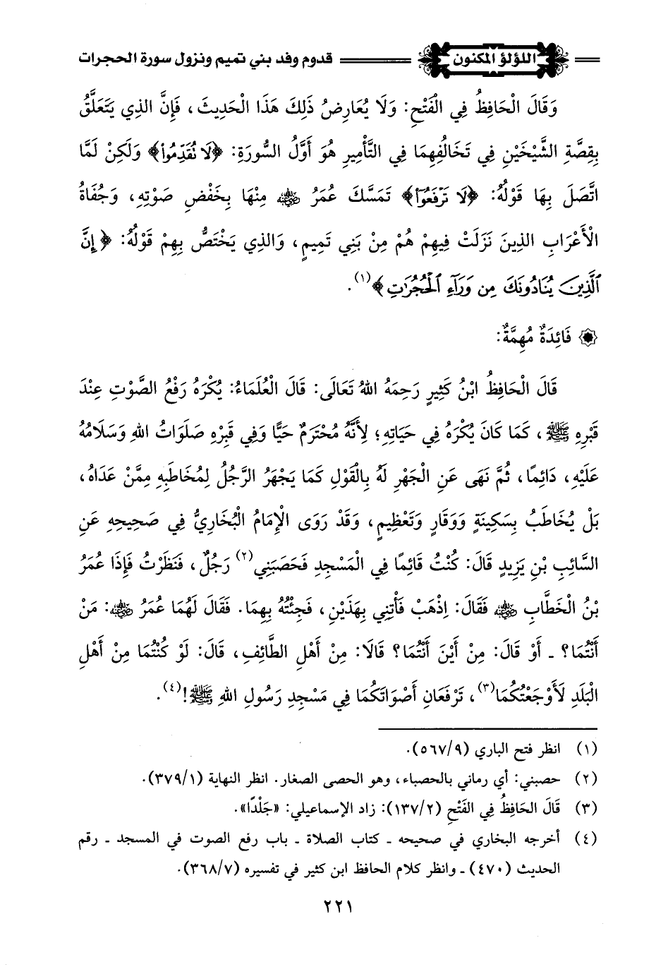 (¬3) أخرجه البخاري في صحيحه - كتاب التفسير - باب {لَا تَرْفَعُوا أَصْوَاتَكُمْ فَوْقَ صَوْتِ النَّبِيِّ} - رقم الحديث (4846) - ومسلم في صحيحه - كتاب الإيمان - باب مخافة المؤمن أن يحبط عمله - رقم الحديث (119) - وأخرجه الإِمام أحمد في مسنده - رقم الحديث (12399).