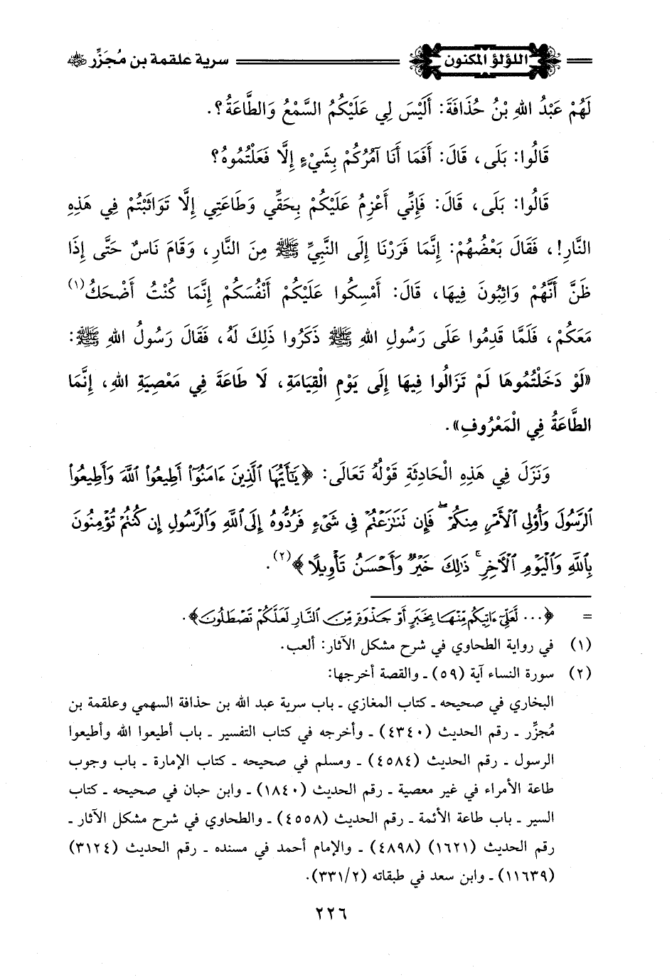 (¬2) قلت: وقد وقع في صحيح البخاري ومسلم أن أمير هذه السرية رجل من الأنصار، وعبد اللَّه بن حذافة السهمي -رضي اللَّه عنه- من المهاجرين.