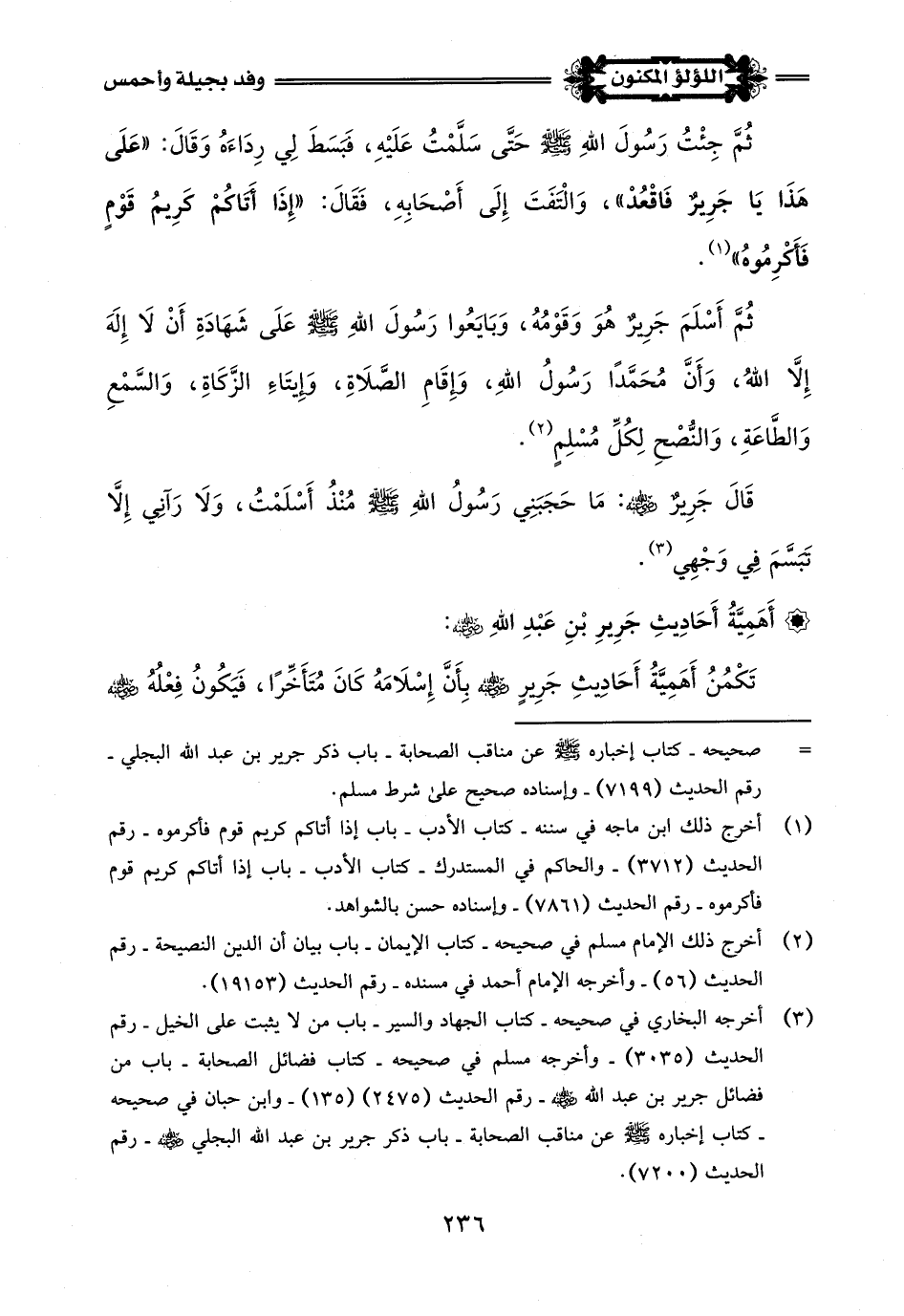 قَدِمَ جَرِيرُ بْنُ عَبْدِ اللَّهِ الْبَجَلِيُّ -رضي اللَّه عنه- الْمَدِينَةَ وَمَعَهُ مِنْ قَوْمِهِ مِائَةٌ وَخَمْسُونَ رَجُلًا، فَلَمَّا دَنَا مِنَ الْمَدِينَةِ، عَرضَ لَهُ رَسُولُ اللَّهِ -صلى اللَّه عليه وسلم- فِي خُطْبَتِهِ، فَقَالَ رَسُولُ اللَّهِ -صلى اللَّه عليه وسلم-: "يَدْخُلُ عَلَيْكُمْ مِنْ هَذَا البَابِ -أَوْ مِنْ هَذَا الفجِّ- مِنْ خَيْرِ ذِي يَمَنٍ، عَلَى وَجْهِهِ مَسْحَةُ مَلَكٍ"، فَأَخَذَ النَّاسُ كُلُّ رَجُلٍ يَرْجُو أَنْ يَكُونَ مِنْ أَهْلِ بَيْتِهِ، فَإِذَا هُمْ بَجَرِيرٌ -رضي اللَّه عنه- قَدْ طَلَعَ مِنَ الثَّنِيَّةِ عَلَى رَاحِلَتِه، ومَعَهُ قَوْمُهُ.