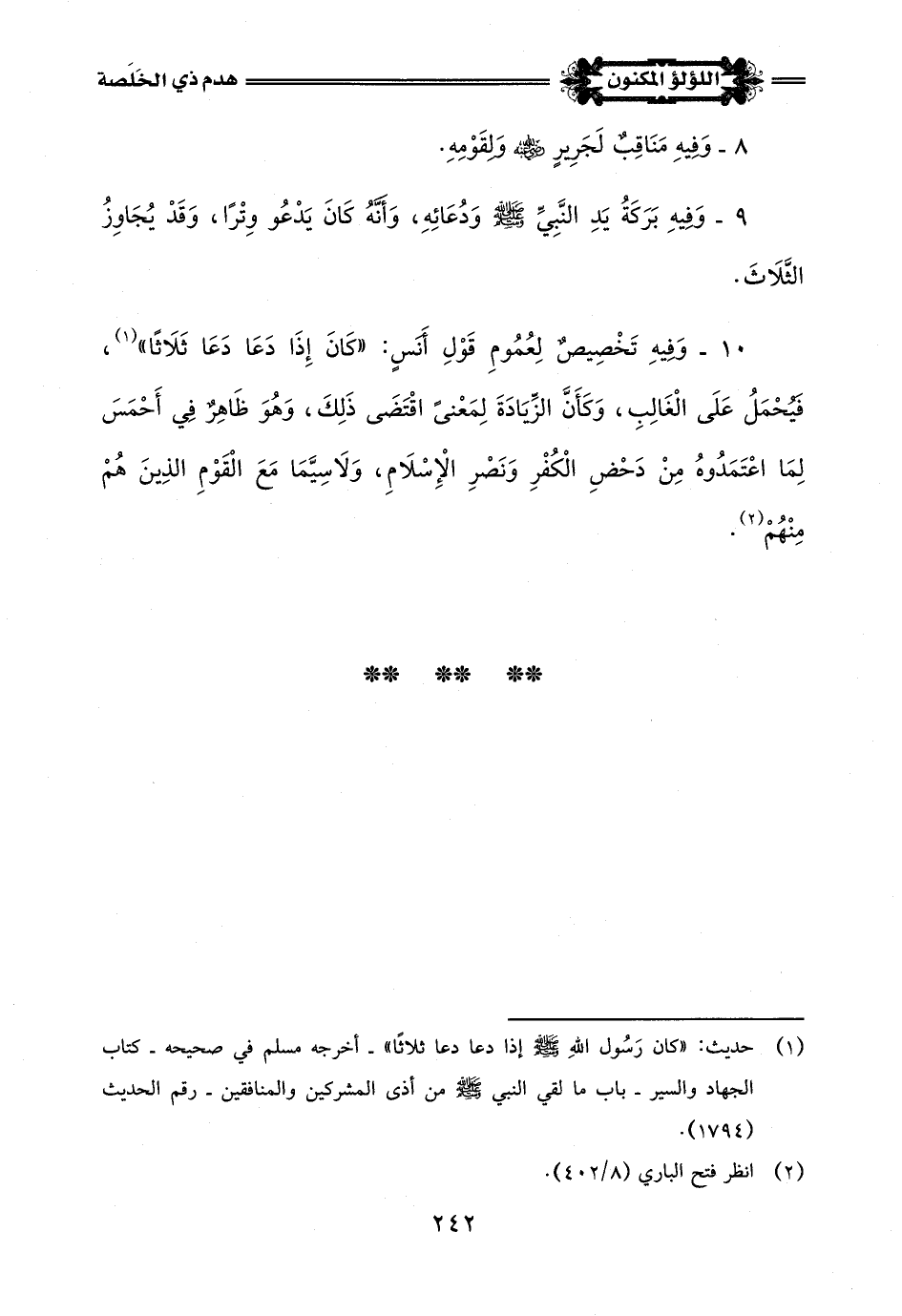 (¬2) أخرج ذلك كله: البخاري في صحيحه - كتاب المغازي - باب غزوة ذي الخلصة - رقم الحديث (4355) (4356) (4357) - ومسلم في صحيحه - كتاب فضائل الصحابة - باب من فضائل جرير بن عبد اللَّه -رضي اللَّه عنه- رقم الحديث (2476) - وابن حبان في صحيحه - كتاب إخباره -صلى اللَّه عليه وسلم- عن مناقب أصحابه - باب ذكر جرير بن عبد اللَّه البجلي - رقم الحديث (7201) (7202) - والطحاوي في شرح مشكل الآثار - رقم الحديث (2497).