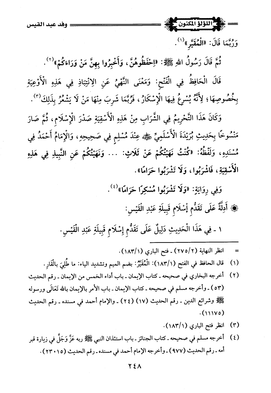 (¬5) النَّقِيرُ: بفتح النون وكسر القاف: هو أَصْلُ النَّخْلَةِ يُنْقَرُ وَسَطُهُ، ثم يُنْبَذُ فيه التَّمْرُ، ويُلْقَى عليه الماءُ لِيَصيرَ نَبِيذًا مُسْكِرًا. انظر النهاية (5/ 91) - فتح الباري (1/ 183).