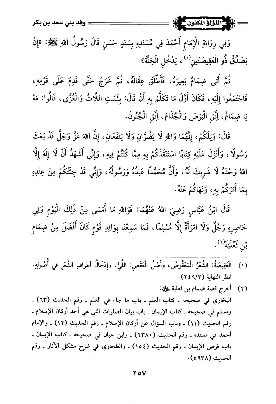 وَفِي رِوَايَةِ الْإِمَامِ أَحْمَدَ فِي مُسْنَدِهِ بِسَنَدٍ حَسَنٍ قَالَ ضِمَامٌ -رضي اللَّه عنه-: سَأُؤَدِّي هَذِهِ الفرَائِضَ، وَأَجْتَنِبُ مَا نَهَيْتَنِي عَنْهُ، ثُمَّ لَا أَزِيدُ وَلَا أَنْقُصُ.