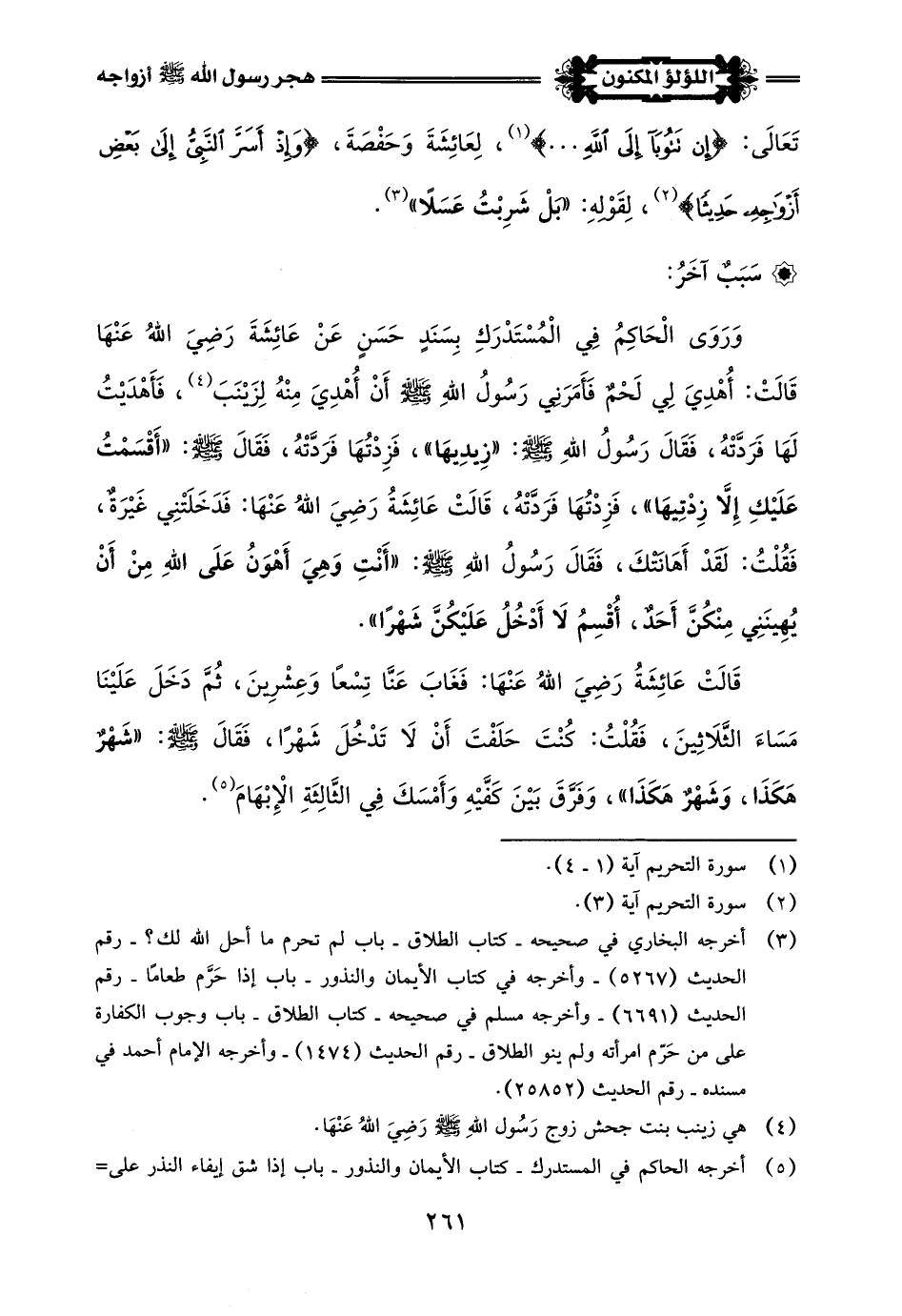 اخْتُلِفَ فِي السَّبَبِ الذِي مِنْ أَجْلِهِ هَجَرَ رَسُولُ اللَّهِ -صلى اللَّه عليه وسلم- نِسَاءَهُ، فَفِي الصَّحِيحَيْنِ عَنْ عَائِشَةَ رَضِيَ اللَّهُ عَنْهَا أَنَّهَا قَالَتْ: أَنَّ النَّبِيَّ -صلى اللَّه عليه وسلم- كَانَ يَمْكُثُ عِنْدَ زَيْنَبَ بِنْتِ جَحْشٍ فَيَشْرَبُ عِنْدَهَا عَسَلًا، فتَوَاصَيْتُ أَنَا وَحَفْصَةُ، أَنَّ أَيَّتُنَا دَخَلَ عَلَيْهَا النَّبِيُّ -صلى اللَّه عليه وسلم- فَلْتَقُلْ: إِنِّي أَجِدُ مِنْكَ رِيحَ مَغَافِيرَ (¬3)، أَكَلْتَ مَغَافِيرَ؟ -وَكَانَ رَسُولُ اللَّهِ -صلى اللَّه عليه وسلم- يَشْتَدُّ عَلَيْهِ أَنْ تُوجَدَ مِنْهُ رِيحٌ كَرِيهَةٌ- فَدَخَلَ عَلَى إِحْدَاهُمَا، فَقَالَتْ لَهُ: ذَلِكَ، فَقَالَ -صلى اللَّه عليه وسلم-: "لَا، بَلْ شَرِبْتُ عَسَلًا عِنْدَ زَيْنَبَ بِنْتِ جَحْشٍ، وَلَنْ أَعُودَ لَهُ"، فنَزَلَتْ: {يَاأَيُّهَا النَّبِيُّ لِمَ تُحَرِّمُ مَا أَحَلَّ اللَّهُ لَكَ. . .} إِلَى قَوْلِهِ