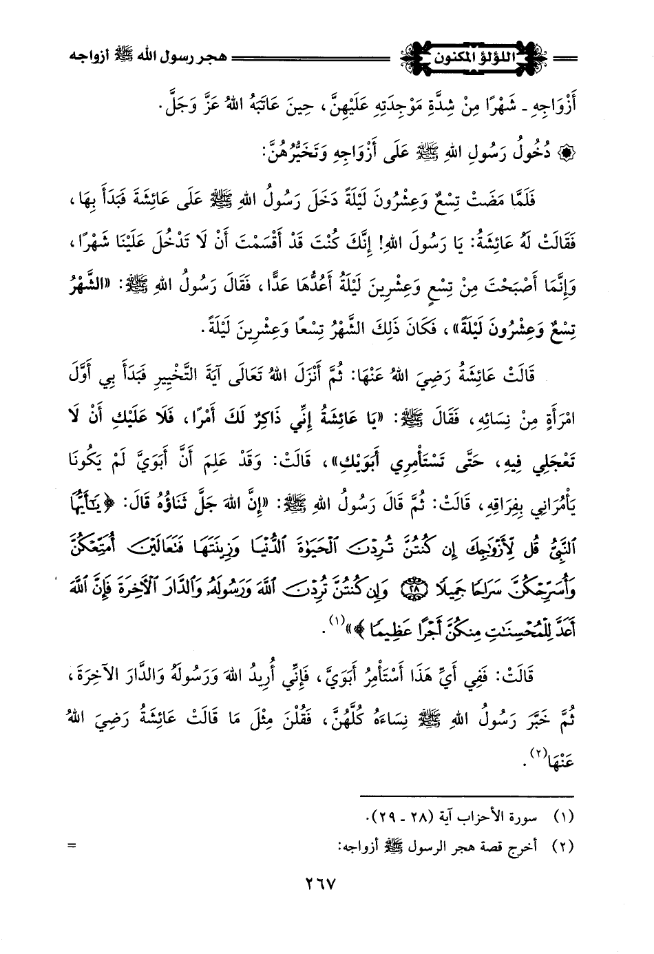 قَالَ عُمَرُ -رضي اللَّه عنه-: وَكَانَ رَسُولُ اللَّهِ -صلى اللَّه عليه وسلم- أَقْسَمَ أَنْ لَا يَدْخُلَ عَلَيْهِنَّ -أَيْ عَلَى