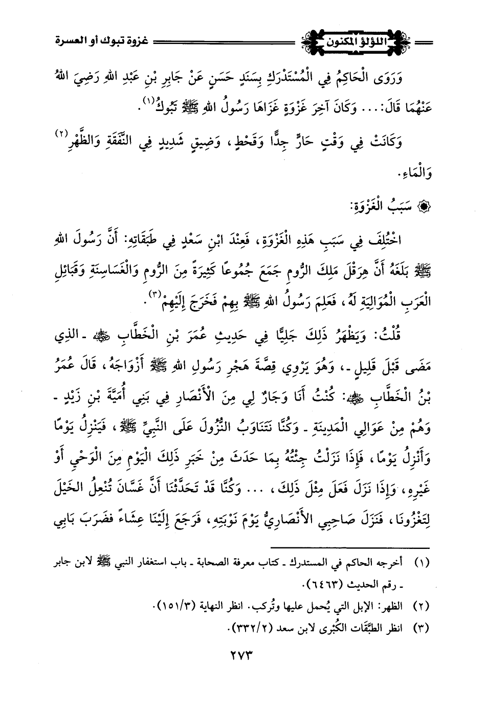 (¬2) وأما تسميتها "العسرة": فبضم العين وسكون السين، والسبب في تسميتها ذلك ما وقع فيها من الشدة والضيق في النفقة والظهر -أي الإبل- والماء، وقد وقع هذا الاسم في القرآن، فقال سبحانه وتَعَالَى في سورة التوبة، آية (117): {لَقَدْ تَابَ اللَّهُ عَلَى النَّبِيِّ وَالْمُهَاجِرِينَ وَالْأَنْصَارِ الَّذِينَ اتَّبَعُوهُ فِي سَاعَةِ الْعُسْرَةِ}.