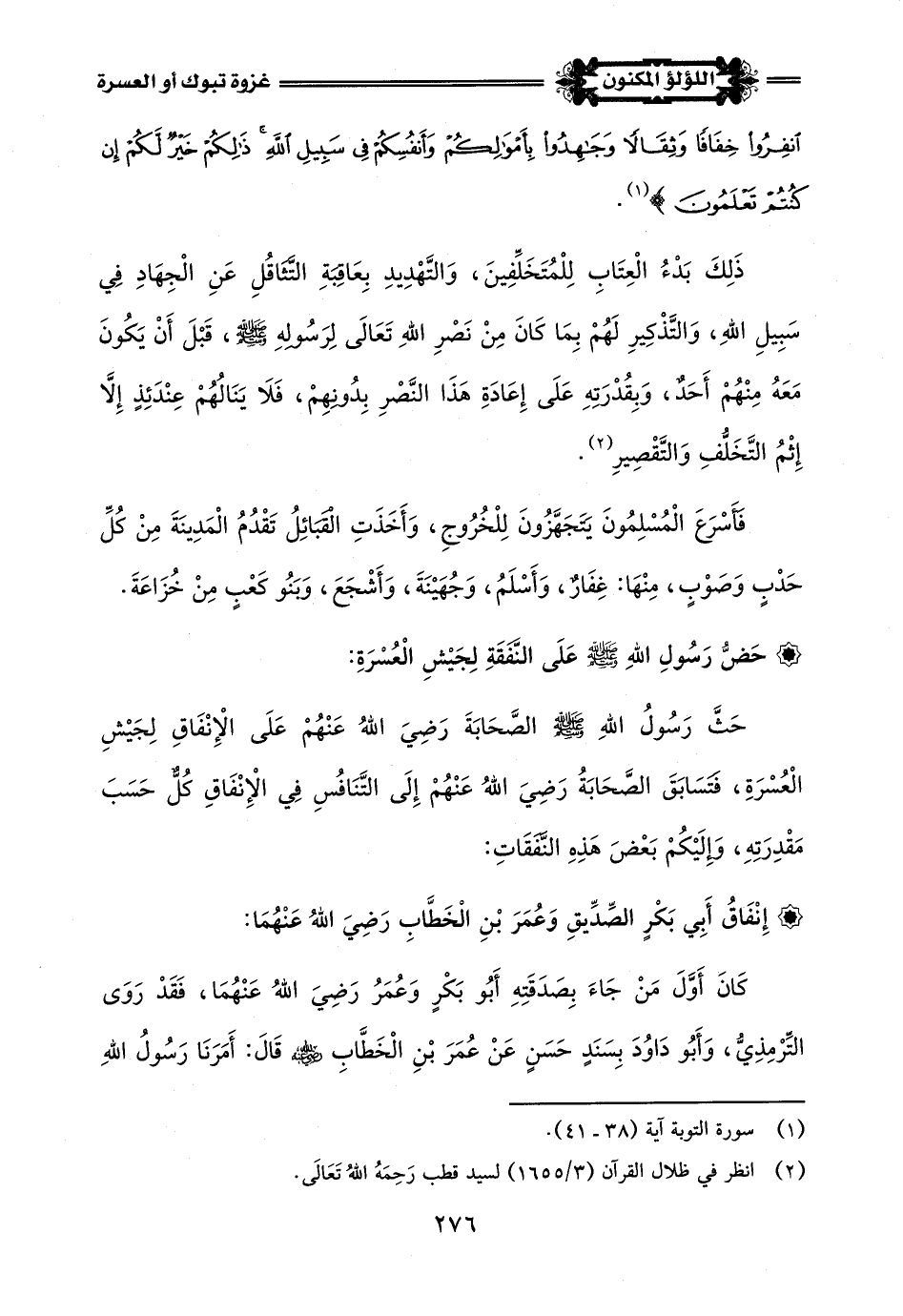 يَخْرُجُ إِلَى غَزْوَةٍ إِلَّا وَوَرَّى (¬1) بِغَيْرِهَا، إِلَّا مَا كَانَ مِنْ غَزْوَةِ خَيْبَرَ وَغَزْوَةِ تَبُوكَ (¬2)، فَغَزْوَةُ خَيْبَرَ، فلِأنَّ اللَّه تَعَالى وَعَدَ رَسُول اللَّهِ -صلى اللَّه عليه وسلم- بفَتْحِهَا، وَأمَّا غزْوَةُ تَبُوكَ، فَلبُعْدِ الشُّقَّةِ (¬3)، وَشِدَّةِ الزَّمَانِ، إِذْ كَانَ ذَلِكَ في شِدَّةِ الْحَرِّ، حِينَ طَابَتِ الظِّلَالُ، وَأَيْنَعَتِ الثِّمَارُ، وَحُبِّبَ إِلَى النَّاسِ الْمُقَامُ، وَكَثْرَةِ الْعَدُوِّ. . . وَكَانَ لِهَذِهِ الْعَوَامِلِ الْمُخْتَلِفَةِ أَثَرُهَا في تَثَاقُلِ بَعْضِ النَّاسِ عِنْدَ النَّفْرَةِ، فَبَدَأَتِ الْآيَاتُ تَنْزِلُ في سُورَةِ التَّوْبَةِ لِتُعَالِجَ هَذَا الْأَمْرَ، فَقَالَ تَعَالَى: {يَاأَيُّهَا الَّذِينَ آمَنُوا مَا لَكُمْ إِذَا قِيلَ لَكُمُ انْفِرُوا فِي سَبِيلِ اللَّهِ اثَّاقَلْتُمْ إِلَى الْأَرْضِ أَرَضِيتُمْ بِالْحَيَاةِ الدُّنْيَا مِنَ الْآخِرَةِ فَمَا مَتَاعُ الْحَيَاةِ الدُّنْيَا فِي الْآخِرَةِ إِلَّا قَلِيلٌ (38) إِلَّا تَنْفِرُوا يُعَذِّبْكُمْ عَذَابًا أَلِيمًا وَيَسْتَبْدِلْ قَوْمًا غَيْرَكُمْ وَلَا تَضُرُّوهُ شَيْئًا وَاللَّهُ عَلَى كُلِّ شَيْءٍ قَدِيرٌ (39) إِلَّا تَنْصُرُوهُ فَقَدْ نَصَرَهُ اللَّهُ إِذْ أَخْرَجَهُ الَّذِينَ كَفَرُوا ثَانِيَ اثْنَيْنِ إِذْ هُمَا فِي الْغَارِ إِذْ يَقُولُ لِصَاحِبِهِ لَا تَحْزَنْ إِنَّ اللَّهَ مَعَنَا فَأَنْزَلَ اللَّهُ سَكِينَتَهُ عَلَيْهِ وَأَيَّدَهُ بِجُنُودٍ لَمْ تَرَوْهَا وَجَعَلَ كَلِمَةَ الَّذِينَ كَفَرُوا السُّفْلَى وَكَلِمَةُ اللَّهِ هِيَ الْعُلْيَا وَاللَّهُ عَزِيزٌ حَكِيمٌ (40)