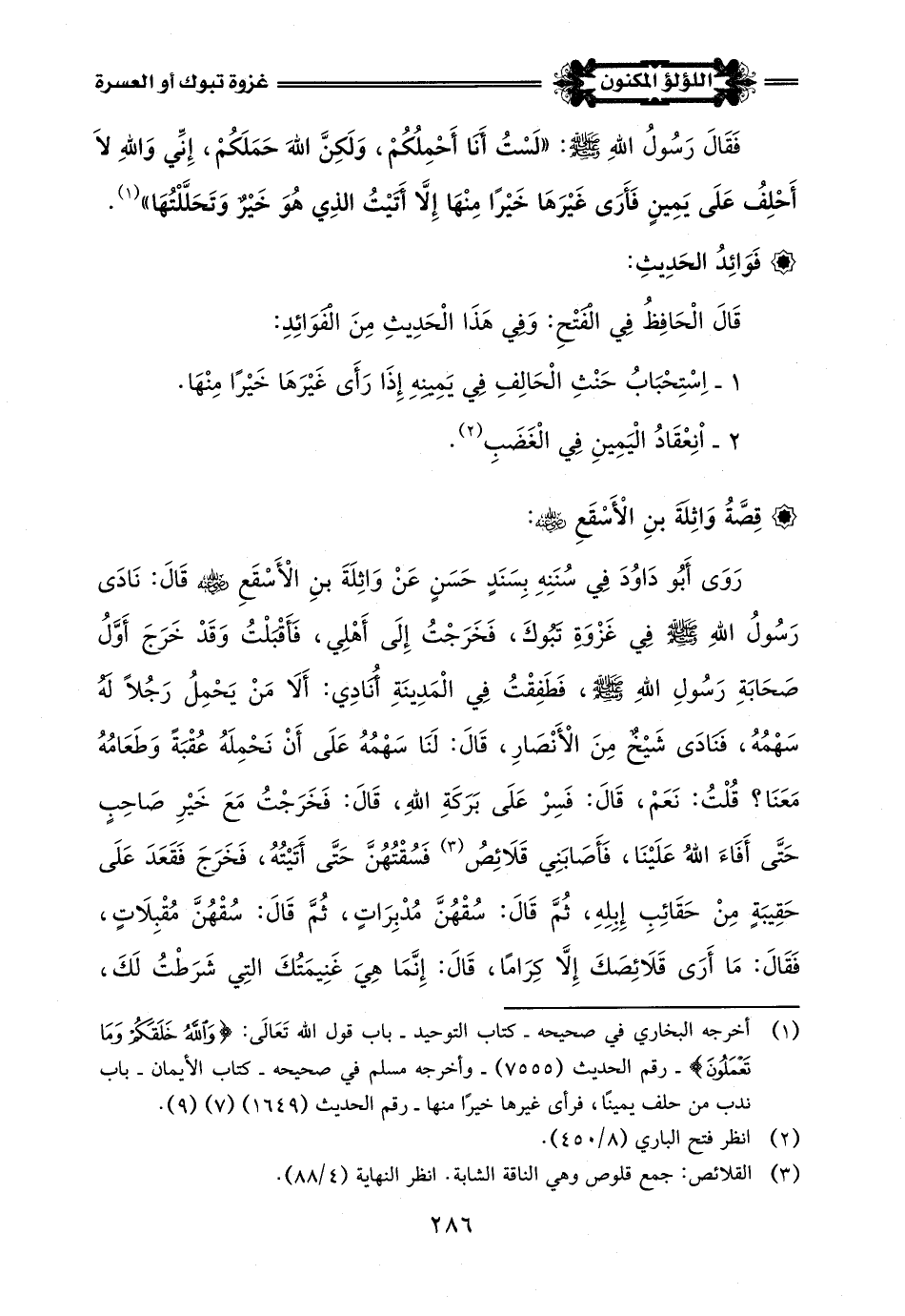 (¬4) أخرجه البخاري في صحيحه - كتاب المغازي - باب غزوة تبوك وهي غزوة العسرة - رقم الحديث (4415) - ومسلم في صحيحه - كتاب الإيمان - باب ندب من حلف يمينًا، فرأى غيرها خيرًا منها - رقم الحديث (1649) (8).
