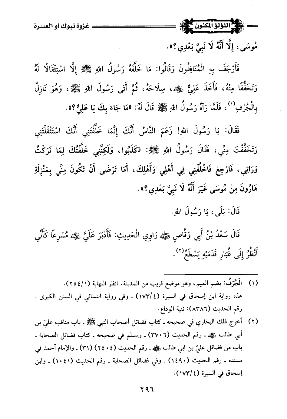 فَقَالَ رَسُولُ اللَّهِ -صلى اللَّه عليه وسلم-: "أَمَا تَرْضَى أَنْ تَكُونَ مِنِّي بِمَنْزِلَةِ هَارُونَ مِنْ