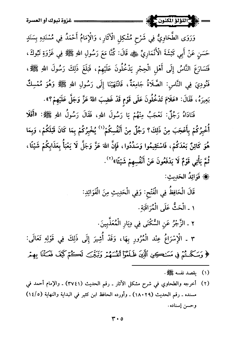 (¬1) أخرجه البخاري في صحيحه - كتاب أحاديث الأنبياء - باب قول اللَّه تَعَالَى: {وَإِلَى ثَمُودَ أَخَاهُمْ صَالِحًا} - رقم الحديث (3378) - ومسلم في صحيحه - كتاب الزهد والرقائق - باب لا تدخلوا مساكن الذين ظلموا أنفسهم - رقم الحديث (2981).