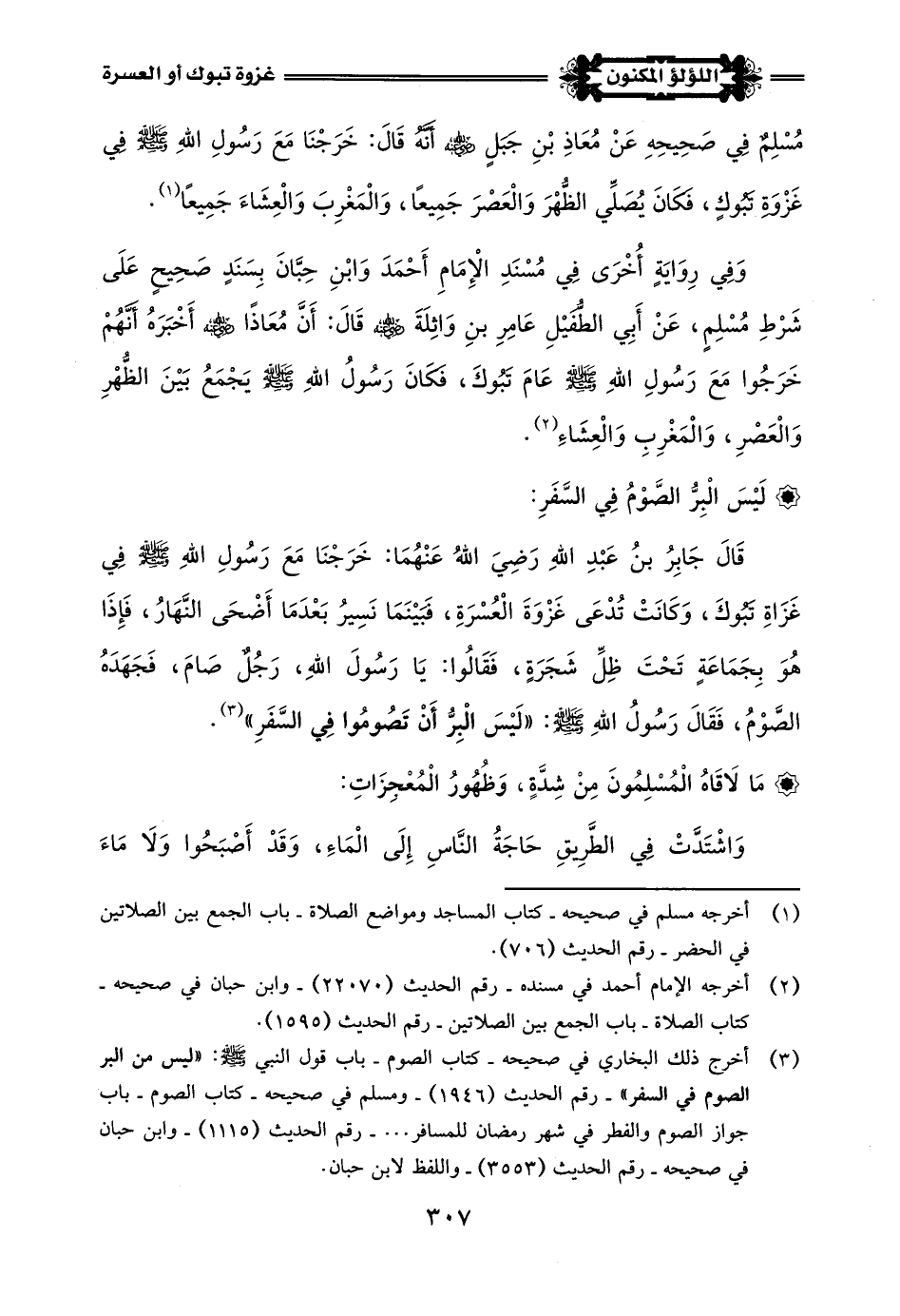 وَكَانَ رَسُولُ اللَّهِ -صلى اللَّه عليه وسلم- يَجْمَعُ بَيْنَ الصَّلَوَاتِ في هَذِهِ الْغَزْوةِ، فَقَدْ أَخْرَجَ الْإِمَامُ