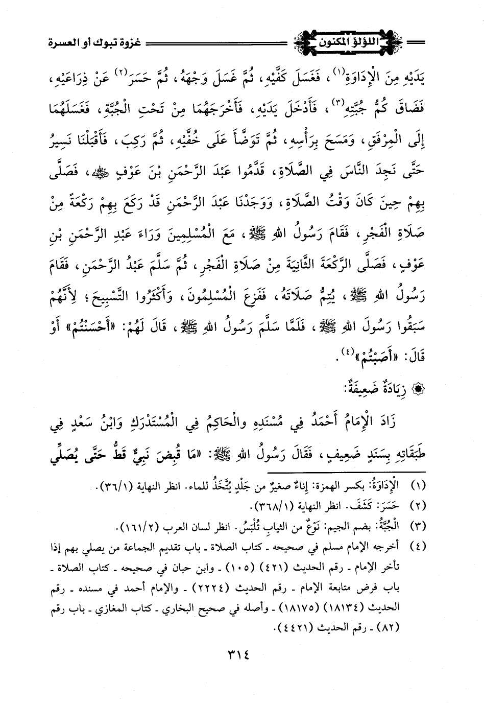 وَفِي طَرِيقِ رَسُولِ اللَّهِ -صلى اللَّه عليه وسلم- إِلَى تَبُوكَ، وَبَعْدَ أَنْ نَزَلَ الْجَيْشُ في اللَّيْلِ، وَعِنْدَ الفجْرِ ذَهَبَ رَسُولُ اللَّهِ -صلى اللَّه عليه وسلم- لِقَضَاءَ الْحَاجَةِ، وَكَانَ مَعَهُ الْمُغِيرَةُ بْنُ شُعْبَةَ -رضي اللَّه عنه-، فتَأَخَّرَ، فَقَدَّمَ الْمُسْلِمُونَ عَبْدَ الرَّحْمَنِ بْنَ عَوْفٍ -رضي اللَّه عنه-، وَصَلَّى بِهِمُ الفجْرَ، وَفِي الرَّكْعَةِ الثَّانِيَةِ جَاءَ رَسُولُ اللَّهِ -صلى اللَّه عليه وسلم-، فَأَدْرَكَ رَكْعَةً، وَأَتَمَّ رَكْعَةً، فَقَدْ رَوَى الْإِمَامُ مُسْلِمٌ، وَابْنُ حِبَّانَ في صَحِيحَيْهِمَا عَنِ الْمُغِيرَةِ بْنِ شُعْبَةَ -رضي اللَّه عنه-، قَالَ: عَدَلَ (¬3) رَسُولُ اللَّهِ -صلى اللَّه عليه وسلم-، وَأَنَا مَعَهُ في غَزْوَةِ تَبُوكٍ، قَبْلَ الفجْرِ، فَعَدَلْتُ مَعَهُ، فَأَنَاخَ رَسُولُ اللَّهِ -صلى اللَّه عليه وسلم-، فَبَرَّزَ (¬4)، ثُمَّ جَاءَنِي، فَسَكَبْتُ (¬5) عَلَى