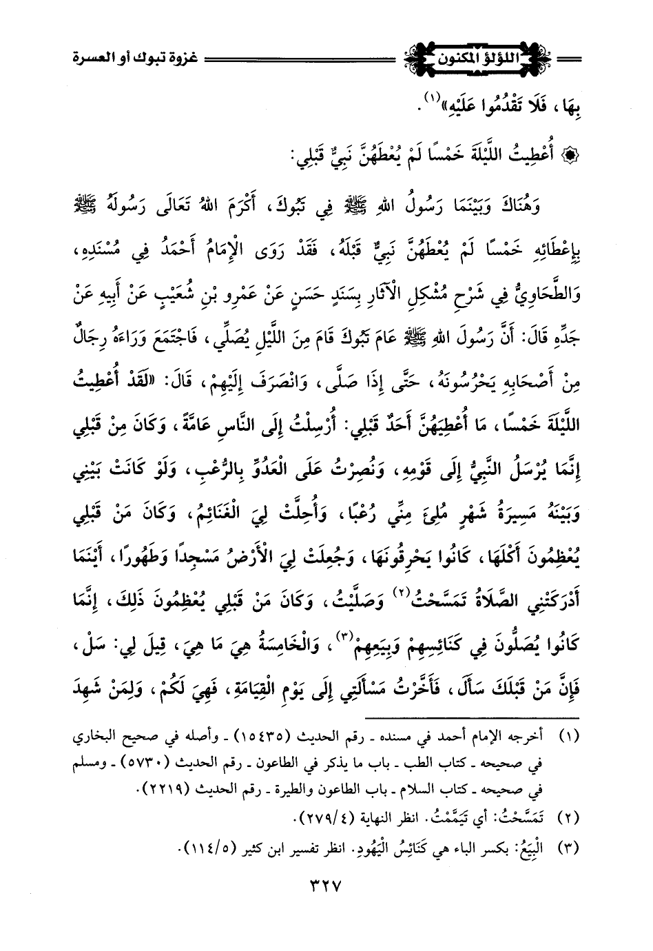 وَهُنَاكَ وَبَيْنَمَا رَسُولُ اللَّهِ -صلى اللَّه عليه وسلم- فِي تَبُوكَ، أَكْرَمَ اللَّهُ تَعَالَى رَسُولَهُ -صلى اللَّه عليه وسلم- بِإِعْطَائِهِ خَمْسًا لَمْ يُعْطَهُنَّ نَبِيٌّ قَبْلَهُ، فَقَدْ رَوَى الْإِمَامُ أَحْمَدُ فِي مُسْنَدِهِ، وَالطَّحَاوِيُّ فِي شَرْحِ مُشْكِلِ الآثار بِسَنَدٍ حَسَنٍ عَنْ عَمْرِو بْنِ شُعَيْبٍ عَنْ أَبِيهِ عَنْ جَدِّهِ قَالَ: أَنَّ رَسُولَ اللَّهِ -صلى اللَّه عليه وسلم- عَامَ تَبوكَ قَامَ مِنَ اللَّيْلِ يُصَلِّي، فَاجْتَمَعَ وَرَاءهُ رِجَالٌ مِنْ أَصْحَابِهِ يَحْرُسُونَهُ، حَتَّى إِذَا صَلَّى، وَانْصَرَفَ إِلَيْهِمْ، قَالَ: "لقَدْ أُعْطِيتُ اللَّيْلةَ خَمْسًا، مَا أُعْطِيَهُنَّ أَحَدٌ قَبْلِي: أُرْسِلْتُ إِلَى النَّاسِ عَامَّةً، وَكَانَ مِنْ قبلي إِنَّمَا يُرْسَلُ النَّبِيُّ إِلَى قَوْمهِ، وَنُصِرْتُ عَلَى الْعَدُوِّ بِالرُّعْبِ، وَلَوْ كَانَتْ بَيْني وَبَيْنَهُ مَسِيرَةُ شَهْرٍ مُلِئَ مِنِّي رُعْبًا، وَأُحِلَّتْ لِيَ الْغَنَائِمُ، وَكَانَ مَنْ قَبْلِي يُعْظِمُونَ أَكْلَهَا، كَانُوا يَحْرِقُونَهَا، وَجُعِلَتْ لِيَ الْأَرْضُ مَسْجِدًا وَطَهُورًا، أَيْنَمَا أَدْرَكتْنِي الصَّلَاةُ تَمَسَّحْتُ (¬2) وَصَلَّيْتُ، وَكَانَ مَنْ قَبْلِي يُعْظِمُونَ ذَلِكَ، إِنَّمَا كَانُوا يُصَلُّونَ فِي