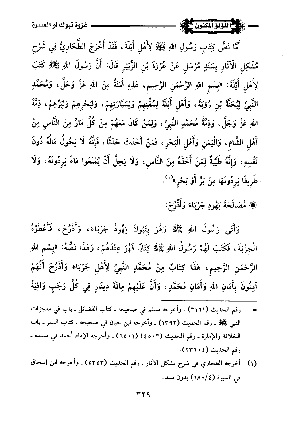 وَأتى رَسُولَ اللَّهِ -صلى اللَّه عليه وسلم- وَهُوَ بِتَبُوكَ يَهُودُ جَرْبَاءَ، وَأَذْرُحَ، فَأَعْطَوْهُ الْجِزْيَةَ، فكَتَبَ لَهُمْ رَسُولُ اللَّهِ -صلى اللَّه عليه وسلم- كِتَابًا فَهُوَ عِنْدَهُمْ، وَهَذَا نَصُّهُ: "بِسْمِ اللَّهِ الرَّحْمَنِ الرَّحِيمِ، هَذَا كتَابٌ مِنْ مُحَمَّدٍ النَّبِيِّ لِأَهْلِ جَرْبَاءَ وَأَذْرُحَ أَنَّهُمْ آمِنُونَ بِأَمَانِ اللَّهِ وَأَمَانِ مُحَمَّدٍ، وَأَنَّ عَلَيْهِمْ مِائَةَ دِينَارٍ فِي كُلِّ رَجَب وَافِيَةً