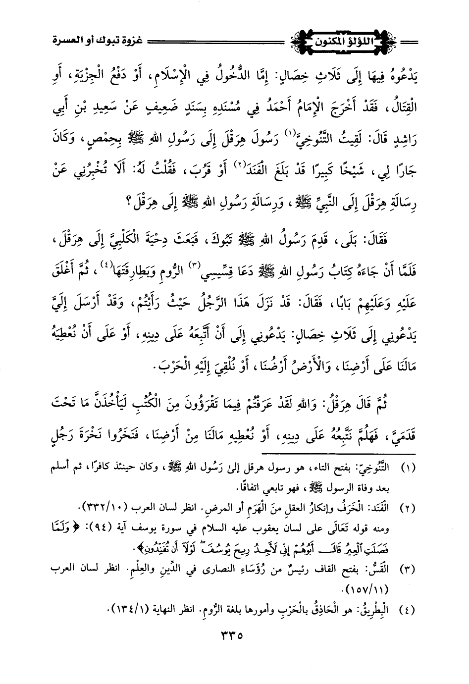 يَدْعُوهُ فِيهَا إِلَى ثَلَاثِ خِصَالٍ: إِمَّا الدُّخُولُ فِي الْإِسْلَامِ، أَوْ دَفع الْجِزيَةِ، أَوِ الْقِتَالُ، فَقَدْ أَخْرَجَ الْإِمَامُ أَحْمَدُ فِي مُسْنَدِهِ بِسَنَدٍ ضَعِيفٍ عَنْ سَعِيدِ بْنِ أَبِي رَاشِدٍ قَالَ: لَقِيتُ التَّنُوخِيَّ (¬1) رَسُولَ هِرَقْلَ إِلَى رَسُولِ اللَّهِ -صلى اللَّه عليه وسلم- بِحِمْصٍ، وَكَانَ جَارًا لِي، شَيْخًا كَبِيرًا قَدْ بَلَغَ الفنَدَ (¬2) أَوْ قَرُبَ، فَقُلْتُ لَهُ: أَلَا تُخْبِرُنِي عَنْ رِسَالَةِ هِرَقْلَ إِلَى النَّبِيِّ -صلى اللَّه عليه وسلم-، وَرِسَالَةِ رَسُولِ اللَّهِ -صلى اللَّه عليه وسلم- إِلَى هِرَقْلَ؟