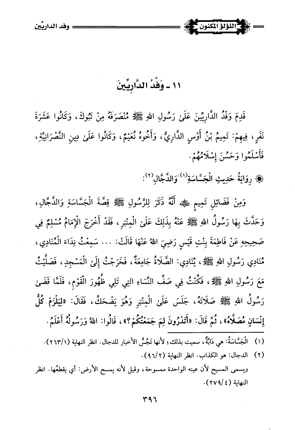 قَالَ رَسُولُ اللَّهِ -صلى اللَّه عليه وسلم-: "إِنِّي، وَاللَّهِ مَا جَمَعتُكُمْ لِرَغْبَةٍ وَلَا لِرَهْبَةٍ، وَلَكِنْ جَمَعْتُكُمْ؛ لِأَنَّ تَمِيمًا الدَّارِيَّ، كَانَ رَجُلًا نَصْرَانِيًا، فَجَاءَ فَبَايَعَ وَأَسْلَمَ، وَحَدَّثَنِي حَدِيثًا وَافَقَ الذِي كنْتُ أُحَدِّثُكُم عَنْ مَسِيحِ الدَّجَّالِ، حَدَّثَنِي: أنَّهُ رَكِبَ فِي سَفِينَةٍ بَحْرِيَّةٍ، مَعَ ثَلَاثِينَ رَجُلًا مِنْ لَخْمٍ وَجُذَامٍ، فَلَعِبَ بِهِمُ الْمَوْجُ شَهْرًا فِي الْبَحْرِ، ثُمَّ أَرْفَؤُوا (¬1) إِلَى جَزِيرة فِي الْبحرِ حَتَّى مَغْرِبِ الشَّمْسِ، فَجَلَسُوا فِي أَقْرُبِ (¬2) السَّفِينَةِ، فَدَخَلُوا الْجَزِيرَةَ، فَلَقِيتُهُمْ دَابَّة أَهْلَبُ (¬3) كَثِيرُ الشَّعْرِ، لَا يَدْرُونَ مَا قُبُلُهُ مِنْ دُبُرِهِ، مِنْ كَثْرَةِ الشَّعْرِ، فَقَالُوا: وَيْلَكِ! مَا أَنْتِ؟