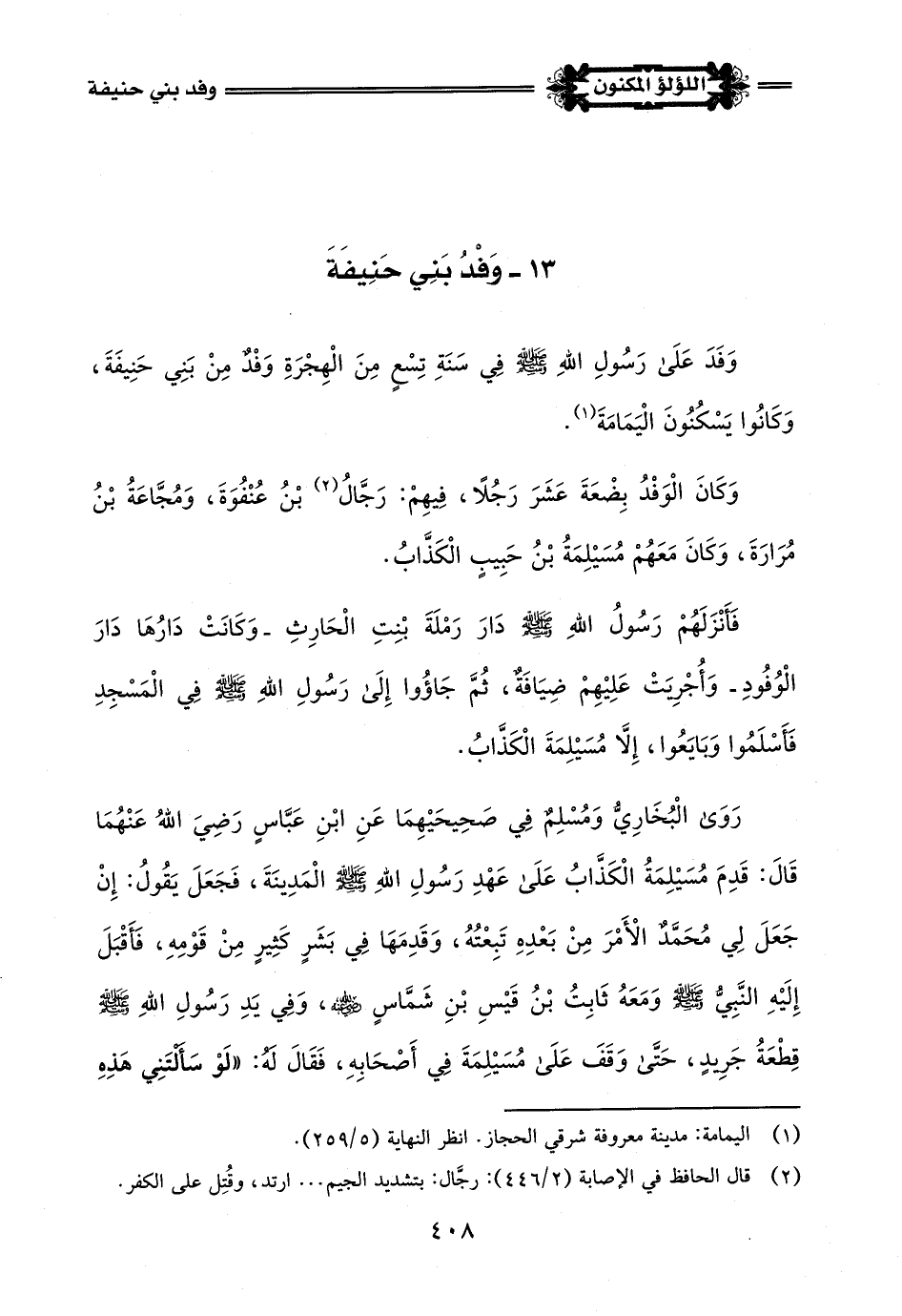 (¬4) أخرجه البخاري في صحيحه - كتاب المغازي - باب وفد بني حنيفة - رقم الحديث (4373) (4374) - وأخرجه مسلم في صحيحه - كتاب الرؤيا - باب رؤيا النبي -صلى اللَّه عليه وسلم- رقم الحديث (2273) - والطحاوي في شرح مشكل الآثار - رقم الحديث (5843).