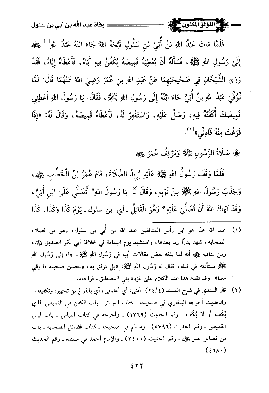 (¬4) أخرج ذلك البخاري في صحيحه - كتاب التفسير - باب {اسْتَغْفِرْ لَهُمْ أَوْ لَا تَسْتَغْفِرْ لَهُمْ} - رقم الحديث (4671) - وباب قوله تعالى: {وَلَا تُصَلِّ عَلَى أَحَدٍ مِنْهُمْ مَاتَ أَبَدًا وَلَا تَقُمْ عَلَى قَبْرِهِ} - رقم الحديث (4672).