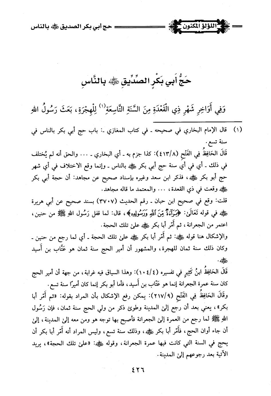 -صلى اللَّه عليه وسلم- أَبَا بَكْرٍ الصِّدِّيقَ -رضي اللَّه عنه-، أَمِيرًا عَلَى الْحَجِّ لِيُقِيمَ لِلْمُسْلِمِينَ حَجَّهُمْ، وَبَقِيَ رَسُولُ اللَّهِ -صلى اللَّه عليه وسلم- فِي الْمَدِينَةِ يتَابع الدَّعْوَةَ وَالْوُفُودَ التِي جَاءَتْ لِتُعْلِنَ إْسِلَامَهَا عِنْدَهُ -صلى اللَّه عليه وسلم- فِي الْمَدِينَةِ النَّبَوِيَّةِ.