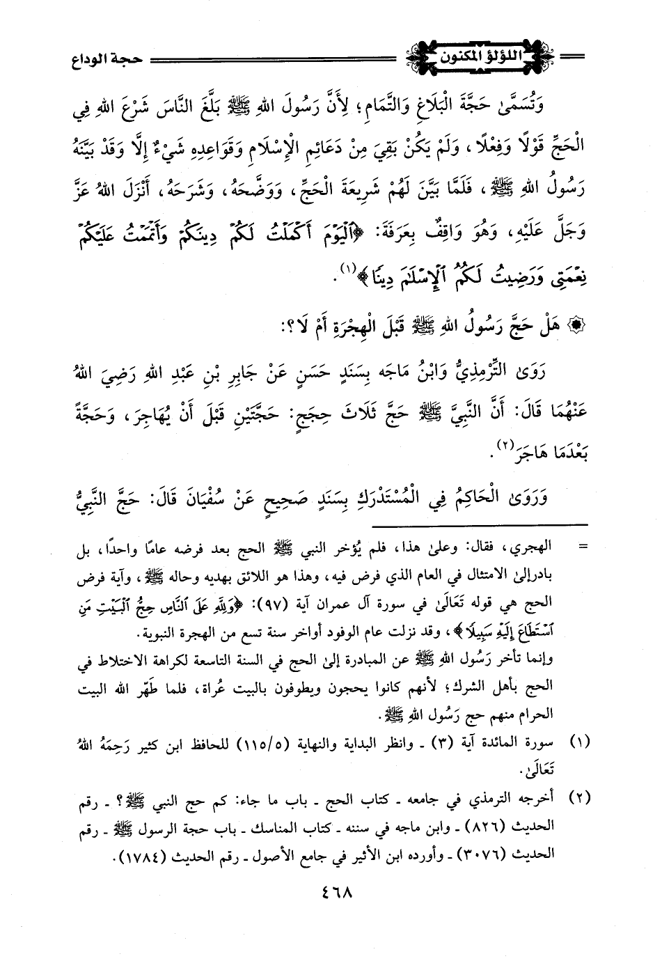 (¬3) أخرج ذلك الإمام مسلم في صحيحه - كتاب الحج - باب حجة النبي -صلى اللَّه عليه وسلم- رقم الحديث (1218) - وابن حبان في صحيحه - كتاب الحج - باب ذكر وصف حجة المصطفى -صلى اللَّه عليه وسلم- رقم الحديث (3944) - والطحاوي في شرح مشكل الآثار - رقم الحديث (3858).