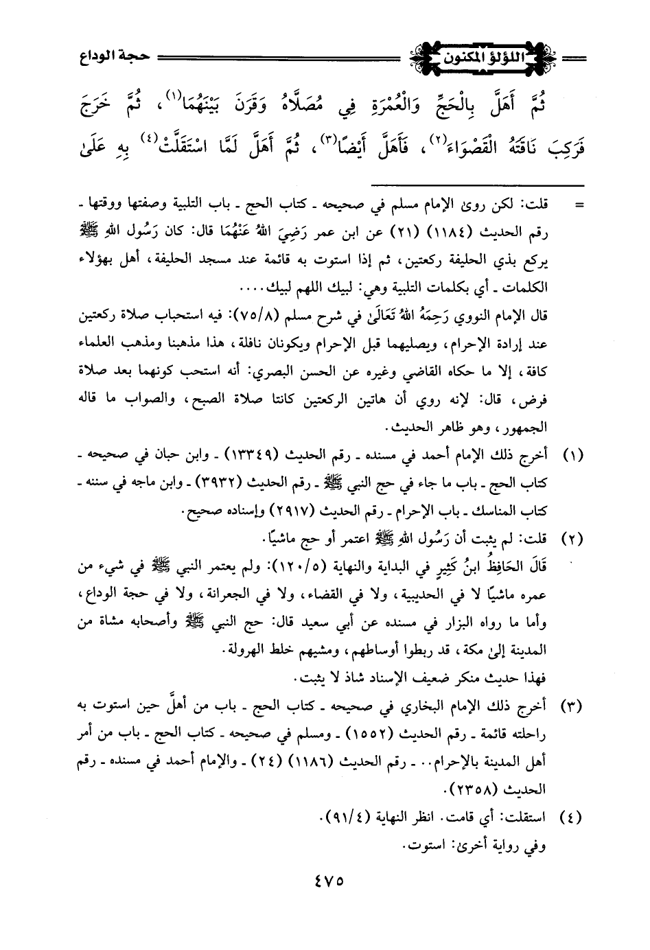 (¬4) أخرج ذلك ابن ماجه في سننه - كتاب المناسك - باب الحج على الرحل - رقم الحديث (2890) - والترمذي في الشمائل - باب ما جاء في تواضع رَسُول اللَّهِ -صلى اللَّه عليه وسلم- رقم الحديث (341) - وأورده الحافظ في الفتح (4/ 156) - والحافظ ابن كثير في البداية والنهاية (5/ 119) وضعفا إسناده - لكن للحديث شواهد كثيرة أوردها الألباني رحمه اللَّه تعالى في السلسلة الصحيحة - رقم الحديث (2617) - وختم كلامه بقوله: وجملة القول أن الحديث صحيح بهذه الطرق.