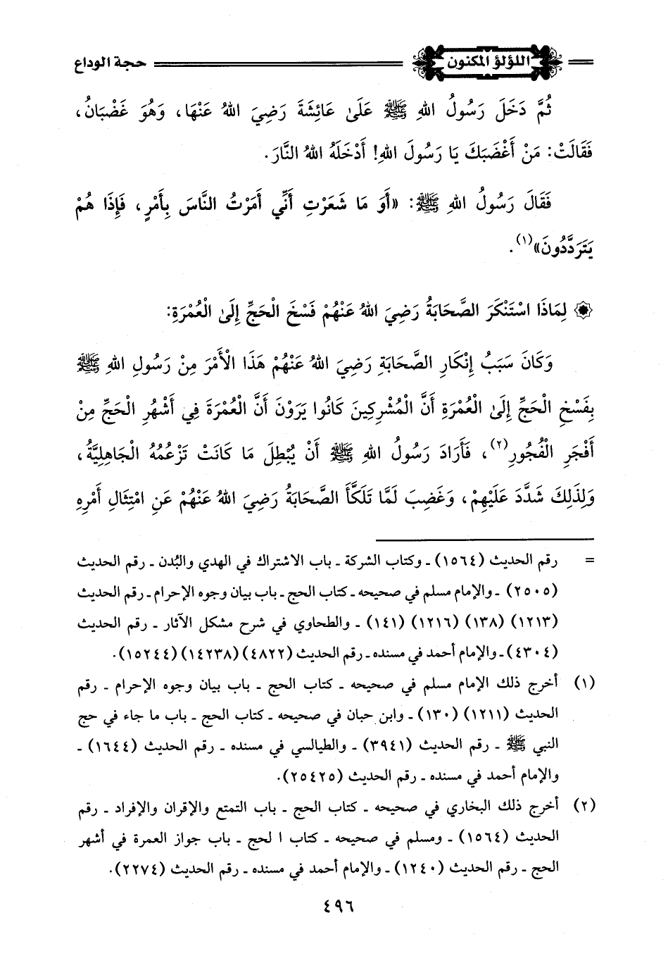 (¬1) أخرج ذلك البخاري في صحيحه - كتاب الحج - باب تقضي الحائض المناسك كلَّها. . رقم الحديث (1651) - ومسلم في صحيحه - كتاب الحج - باب بيان وجوه الإحرام - رقم الحديث (1216) - والإمام أحمد في مسنده - رقم الحديث (14409) - وابن حبان في صحيحه - كتاب الحج - باب الإحرام - رقم الحديث (3791) - والطحاوي في شرح مشكل الآثار - رقم الحديث (4300).