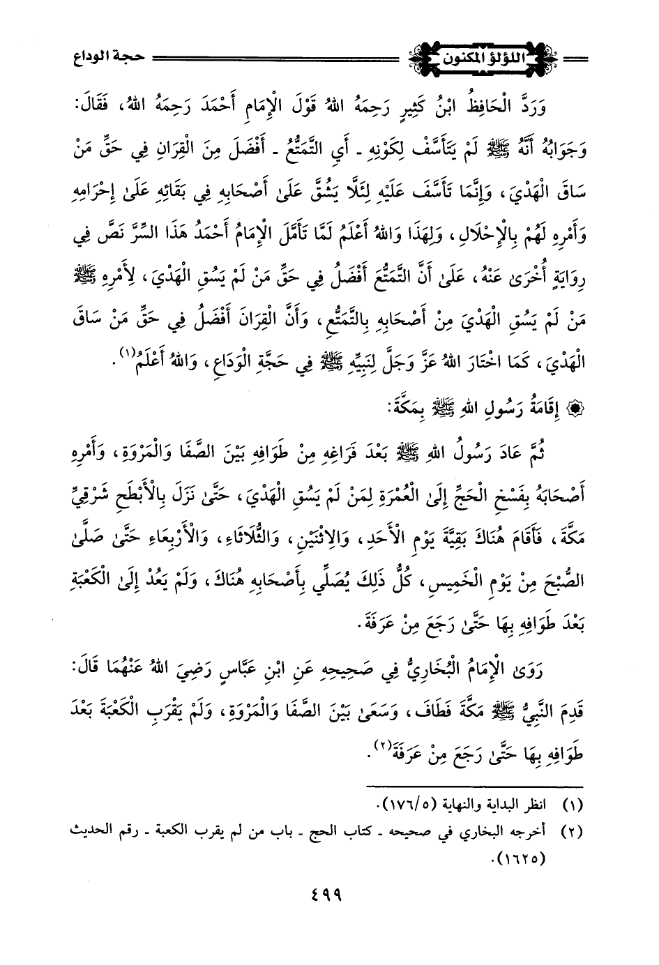 وَكَانَ رَسُولُ اللَّهِ -صلى اللَّه عليه وسلم- مُدَّةَ إِقَامَتِهِ هُنَاكَ إِلَى يَوْمِ التَّرْوِيَةِ يَقْصُرُ الصَّلَاةَ، فَقَدْ أَخْرَجَ الشَّيْخَانِ فِي صَحِيحَيْهِمَا عَنْ أَبِي جُحَيْفَةَ -رضي اللَّه عنه- قَالَ: خَرَجَ رَسُولُ اللَّهِ -صلى اللَّه عليه وسلم- بِالْهَاجِرَةِ (¬2) إِلَى الْبَطْحَاءِ (¬3)، فتَوَضَّأَ (¬4)، وَصَلَّى الظُّهْرَ رَكْعَتَيْنِ، وَالْعَصْرَ رَكْعَتَيْنِ، وَبَيْنَ يَدَيْهِ عَنَزَةٌ (¬5)، وَكَانَ يَمُرُّ مِنْ وَرَائِهَا الْحِمَارُ وَالْمَرْأَةُ، ثُمَّ قَامَ النَّاسُ، فَجَعَلُوا يَأْخُذُونَ يَدَهُ، فَيَمْسَحُونَ بِهَا وُجُوهَهُمْ، فَأَخَذْتُ يَدَهُ، فَوَضَعْتُهَا عَلَى وَجْهِي، فَإِذَا هِيَ أَبْرَدُ مِنَ الثَّلْجِ، وَأَطْيَبُ رِيحًا مِنَ الْمِسْكِ (¬6).